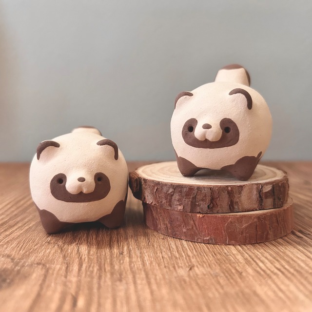まんまるボディのちびこいたぬきの置物です 植木鉢に潜ませたり、アクセサリーボックスに入れてみたり。一緒にお出かけしやすい大きさです。特に役には立たないけれどどこにでもいてくれる子たぬきはいかがでしょうか。 お腹に穴が空いているので竹串などにつけて写真を撮ったりもできます。 小さなひびや焼きむらが出ることがございますが、焼き物の特性上避けられないものですので、気になる場合はご購入をお控え下さい。 今までに販売したちびまるたぬきと色味が少し異なる場合がございますす。ご了承ください。 サイズ 4×3cmほど ※野外での写真撮影に使用したたぬきはお客様のもとへお届けする子ではありませんのでご安心ください。 ご注意 ・手捻りでひとつひとつ作っているため、ぐらついたり柄に個体差が出ます。 ・1200度以上の高温で焼いているため、焼き色に濃淡の差が出る場合がございます。一部柄の薄い部分があることがございます。 ・塩茹でなどは陶器に負担をかけますのでお控えください。 ・ご到着時の破損以外は補償できかねませんのでご注意ください。