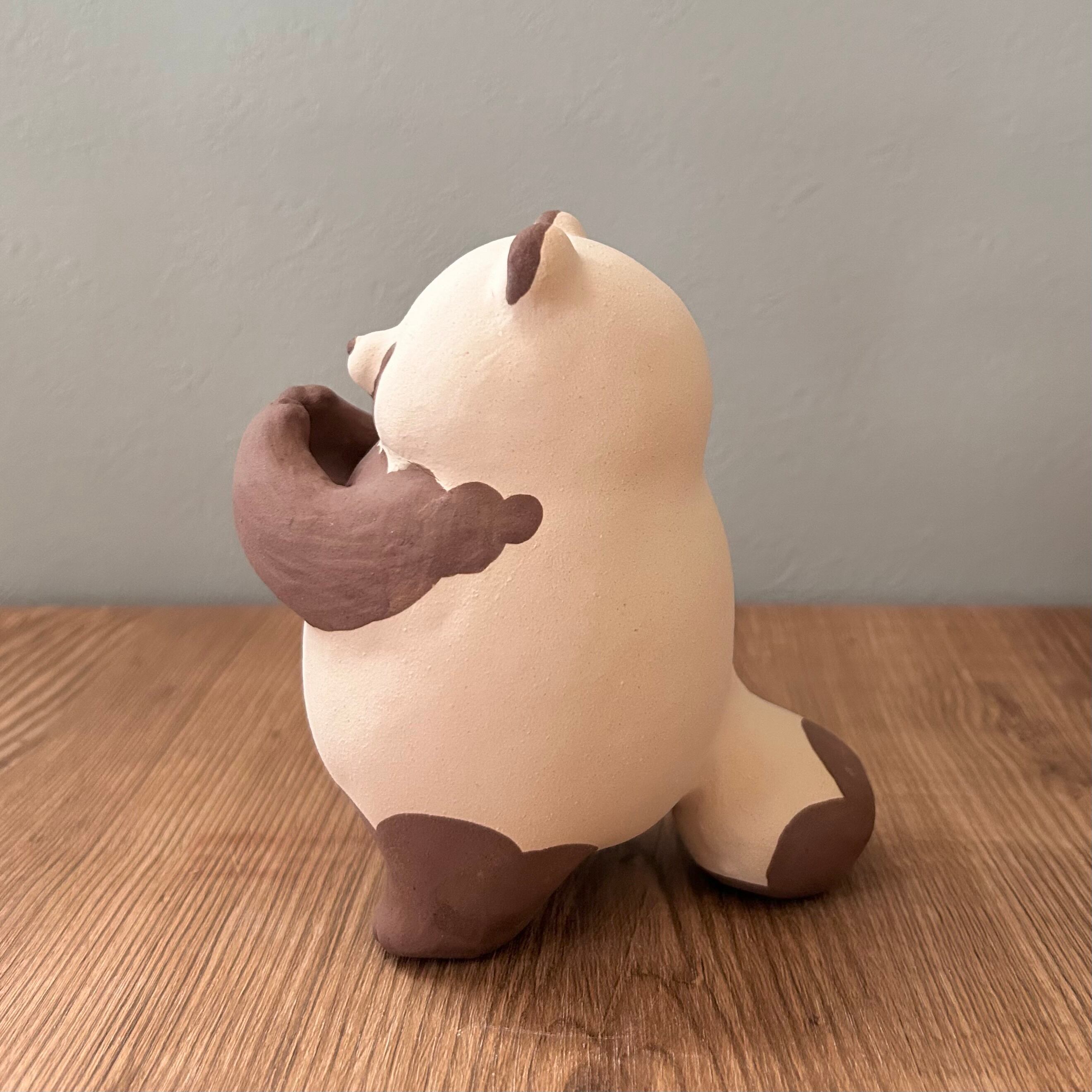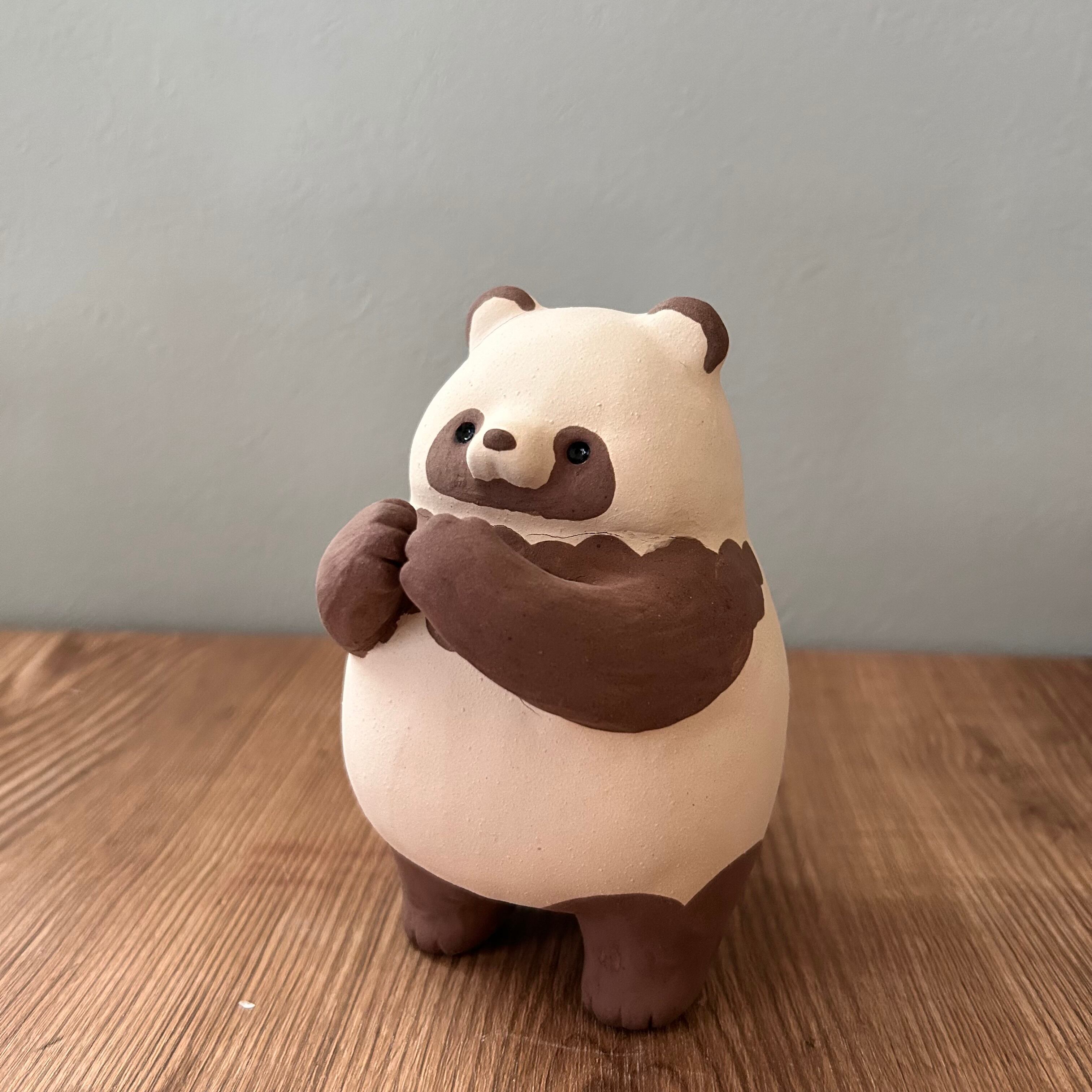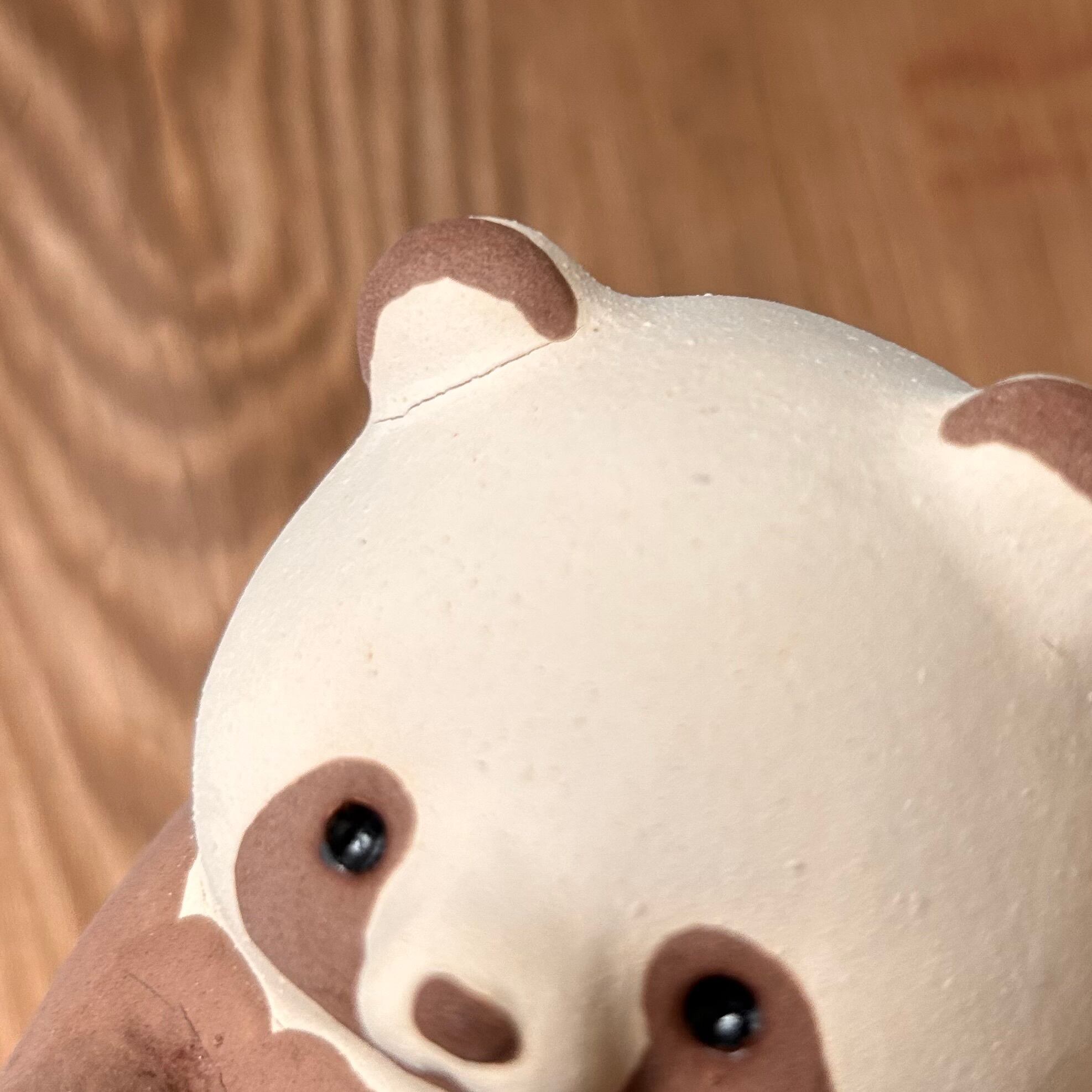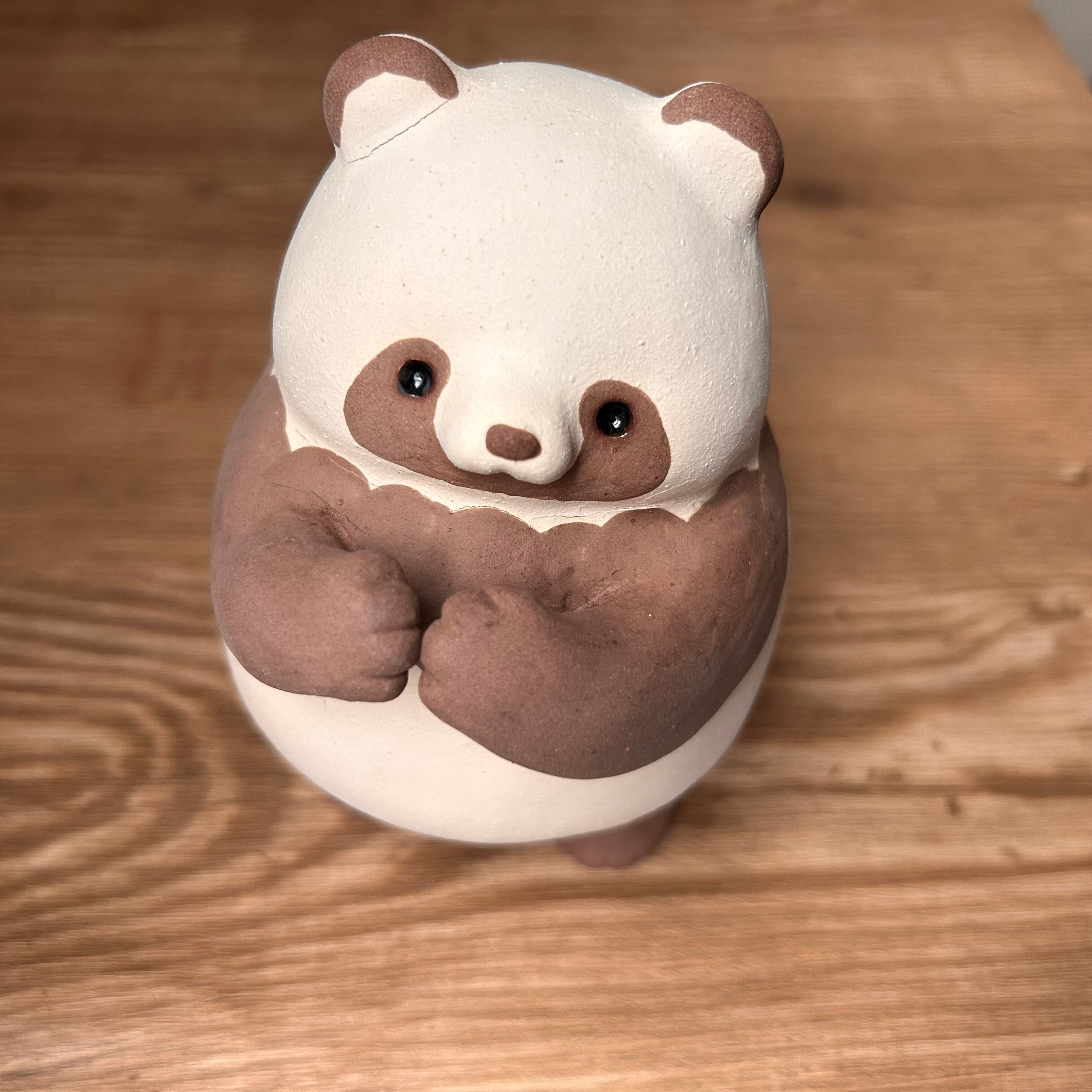 ヒビは粘土の上にかけた泥の部分にあるもので、ほかのたぬきたちと変わりありません。硬いのなどで強く押すとヒビが大きくなりますのでお取り扱いにはご注意ください。