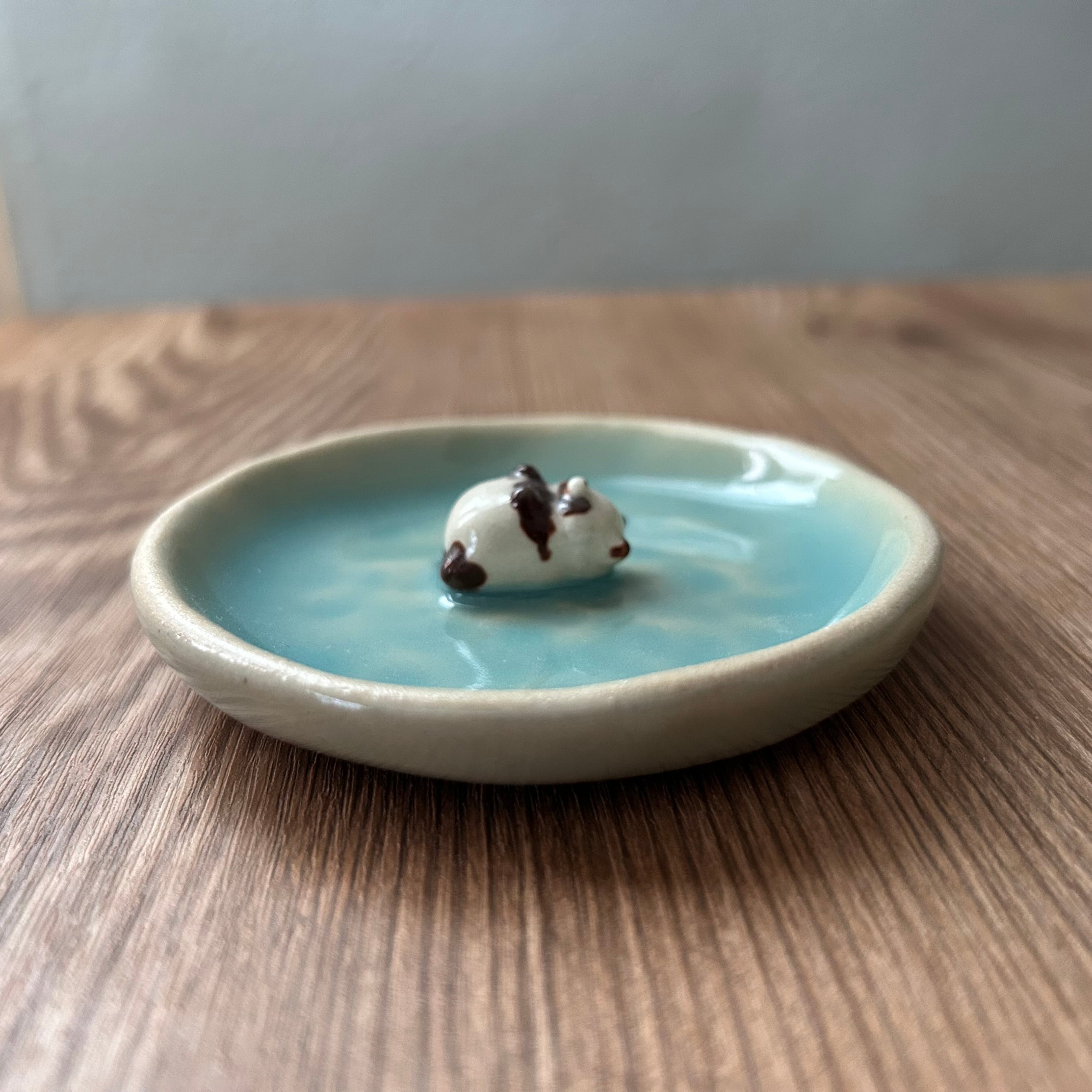 手捻りで成形し波模様をつけたお皿に、浅瀬色の釉薬を厚がけして仕上げました