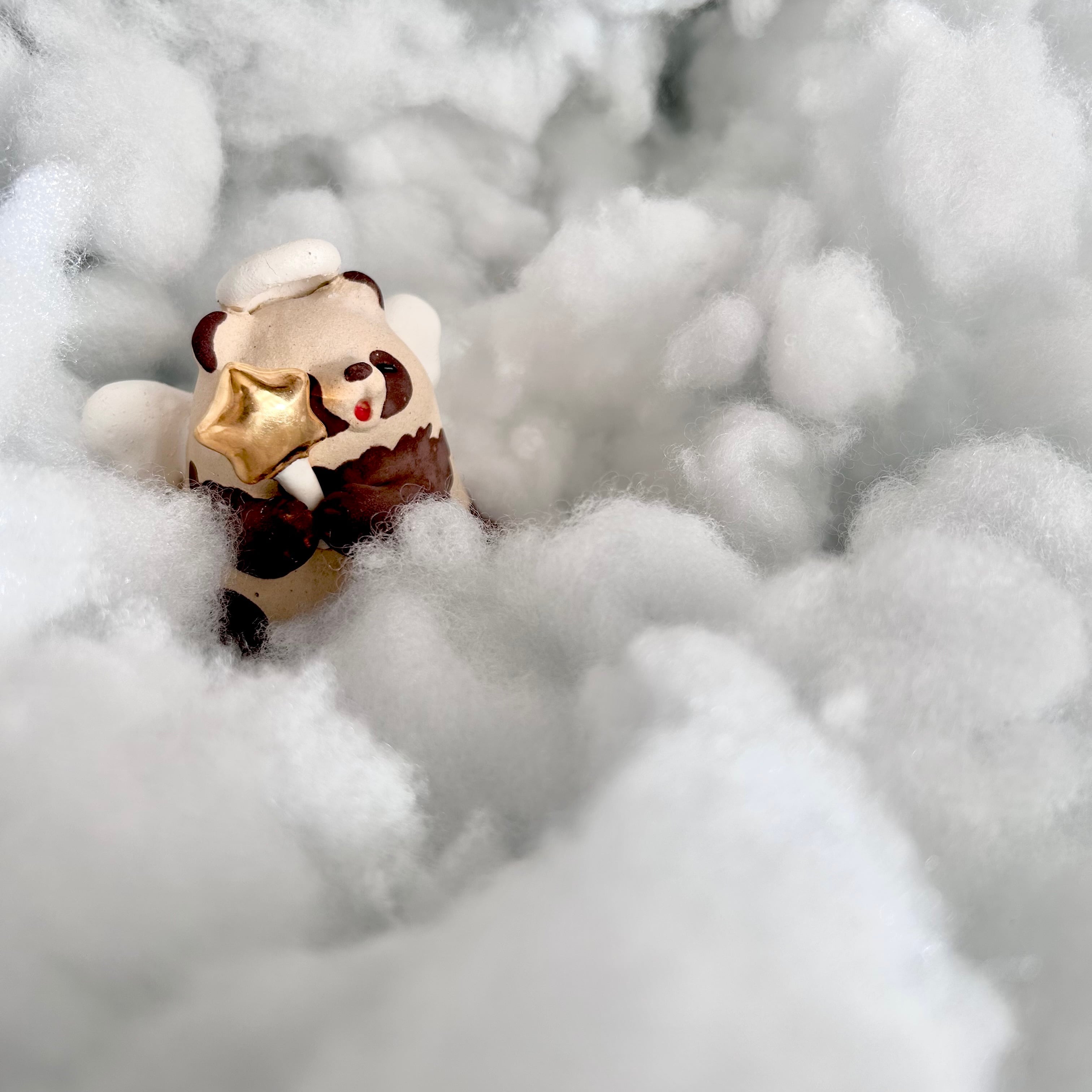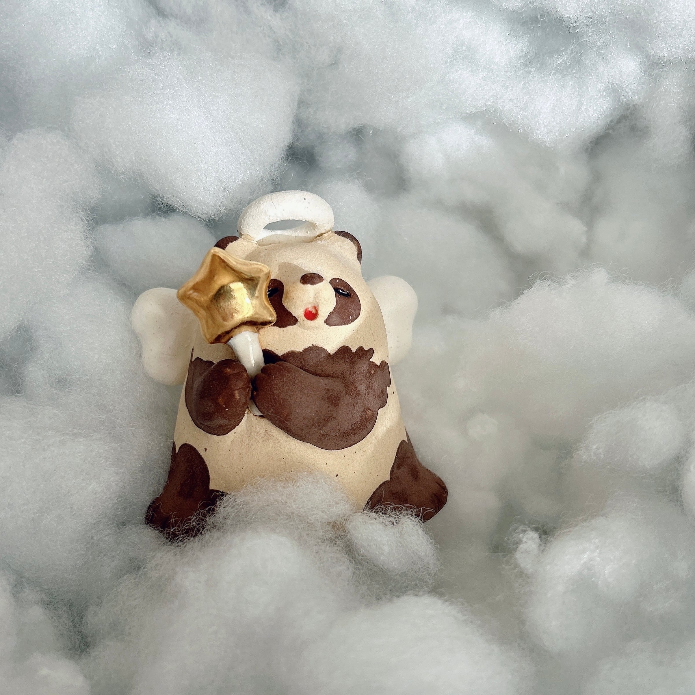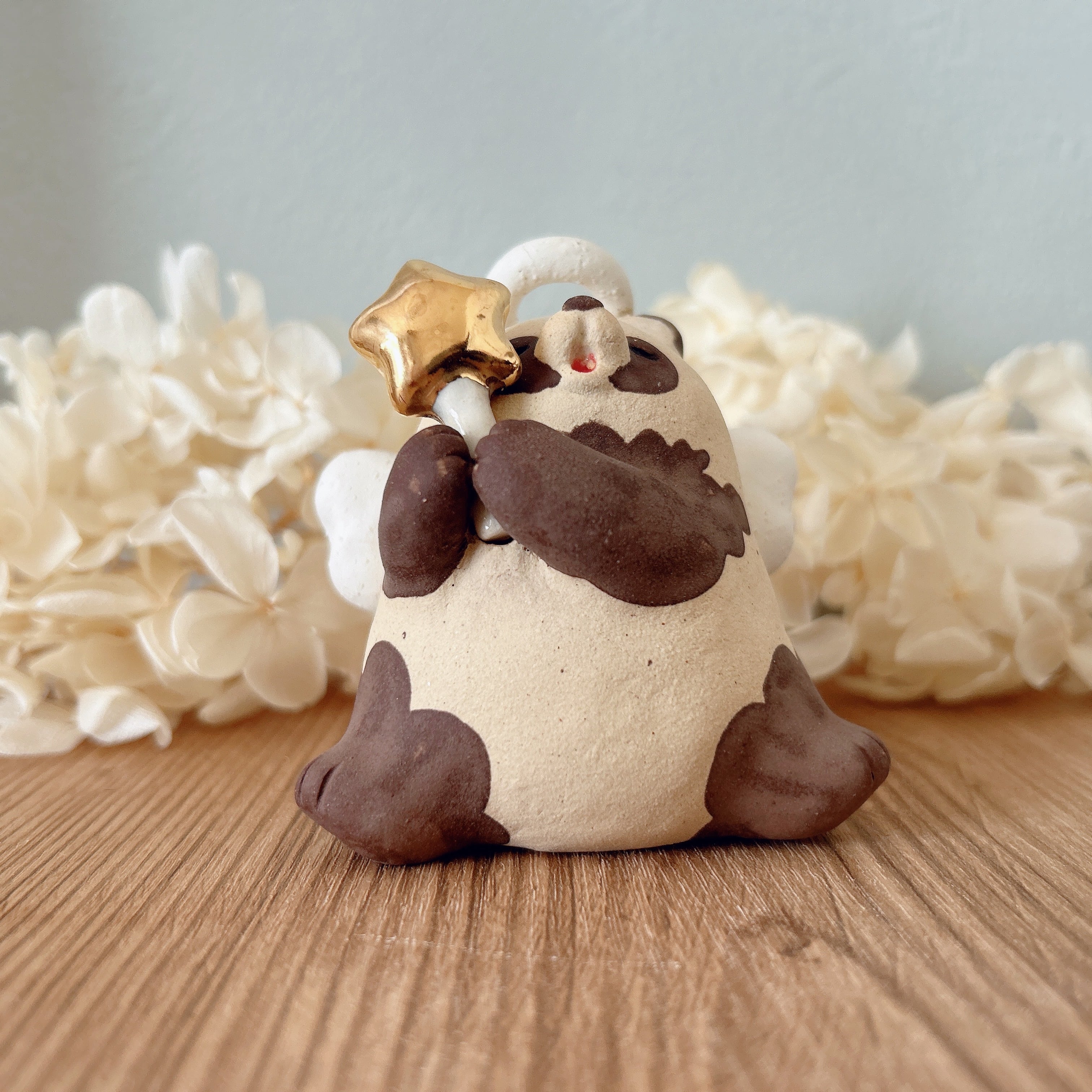 きんぴかな星のステッキを持った天使なたぬきの置物です。