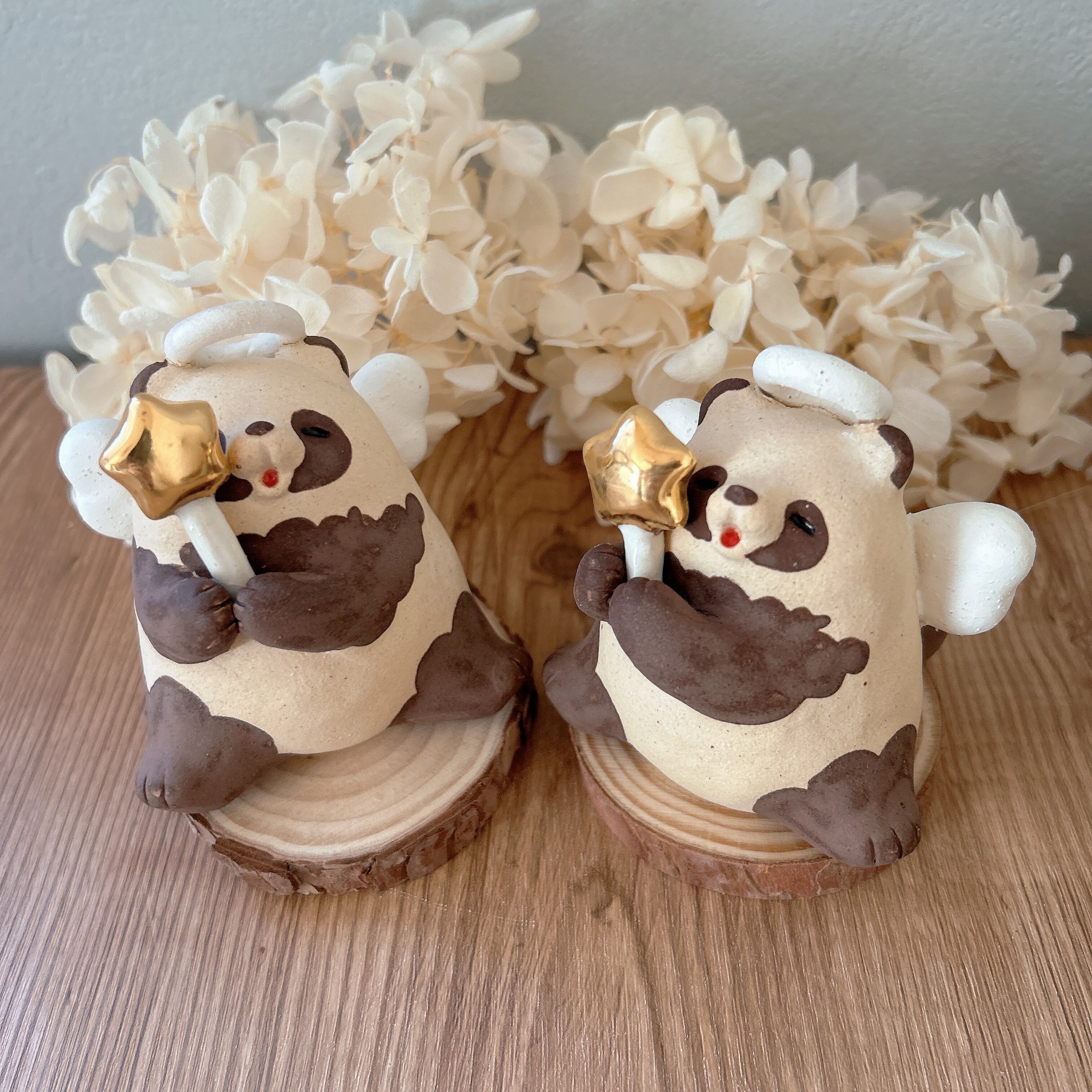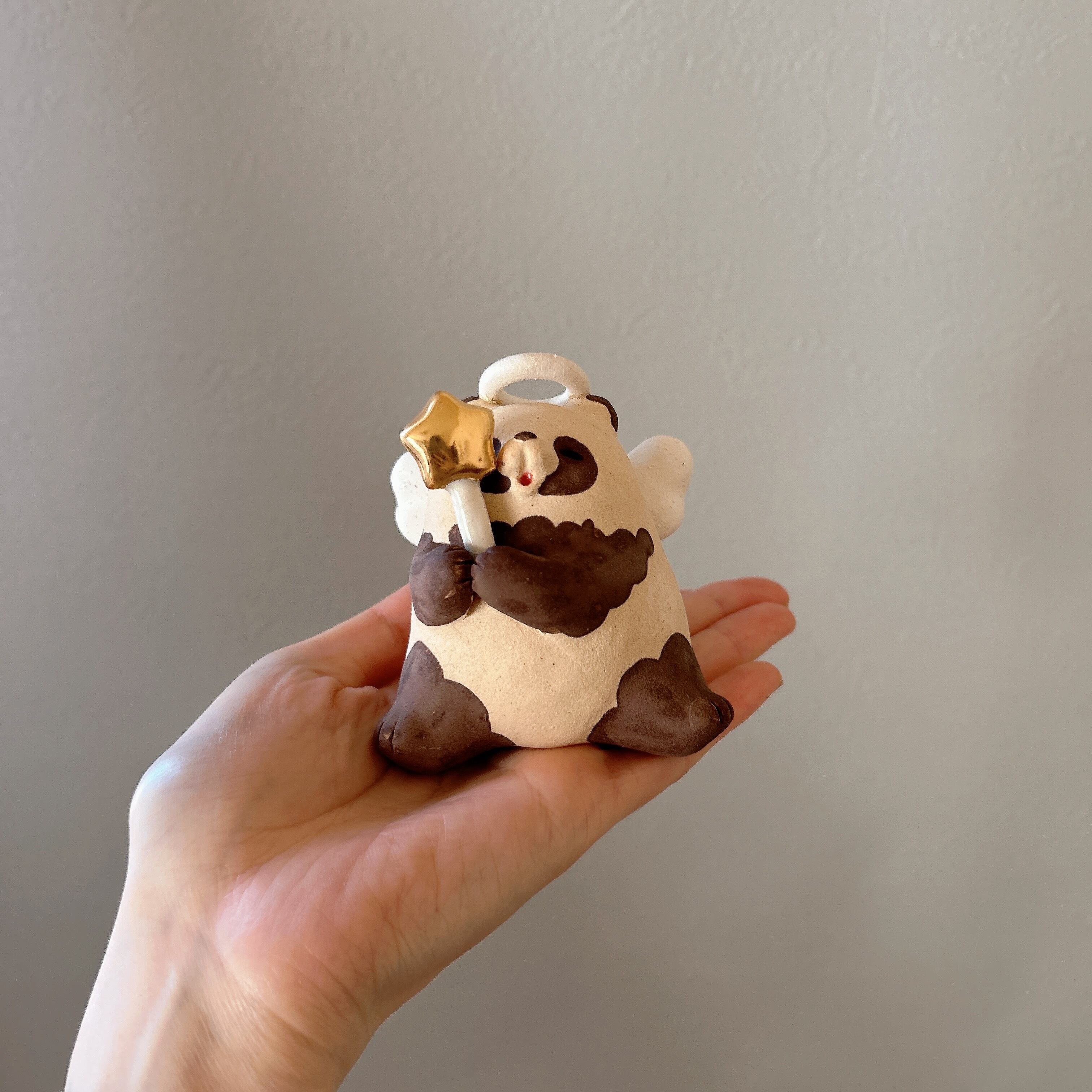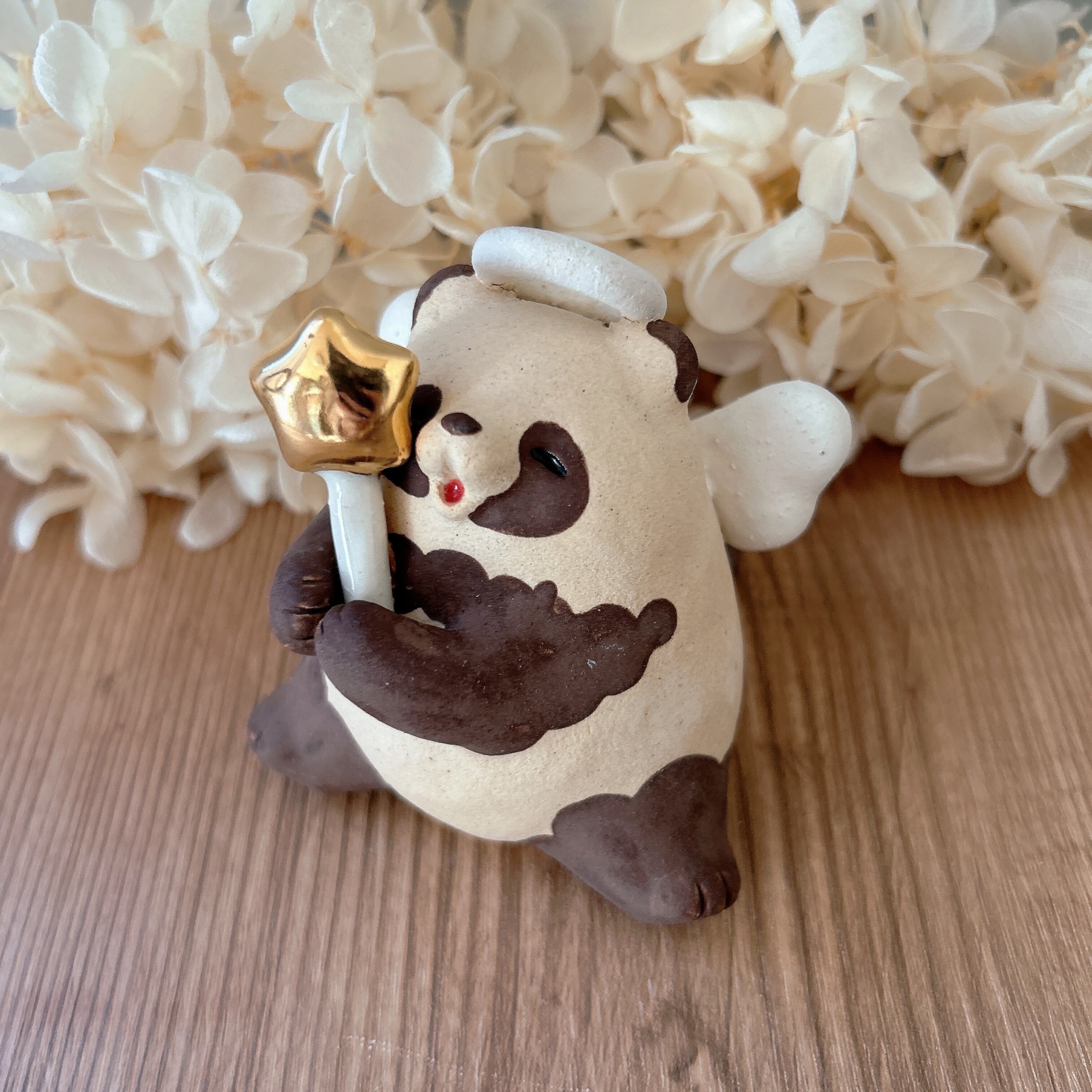 きんぴかな星のステッキを掲げる天使なたぬきの置物です。