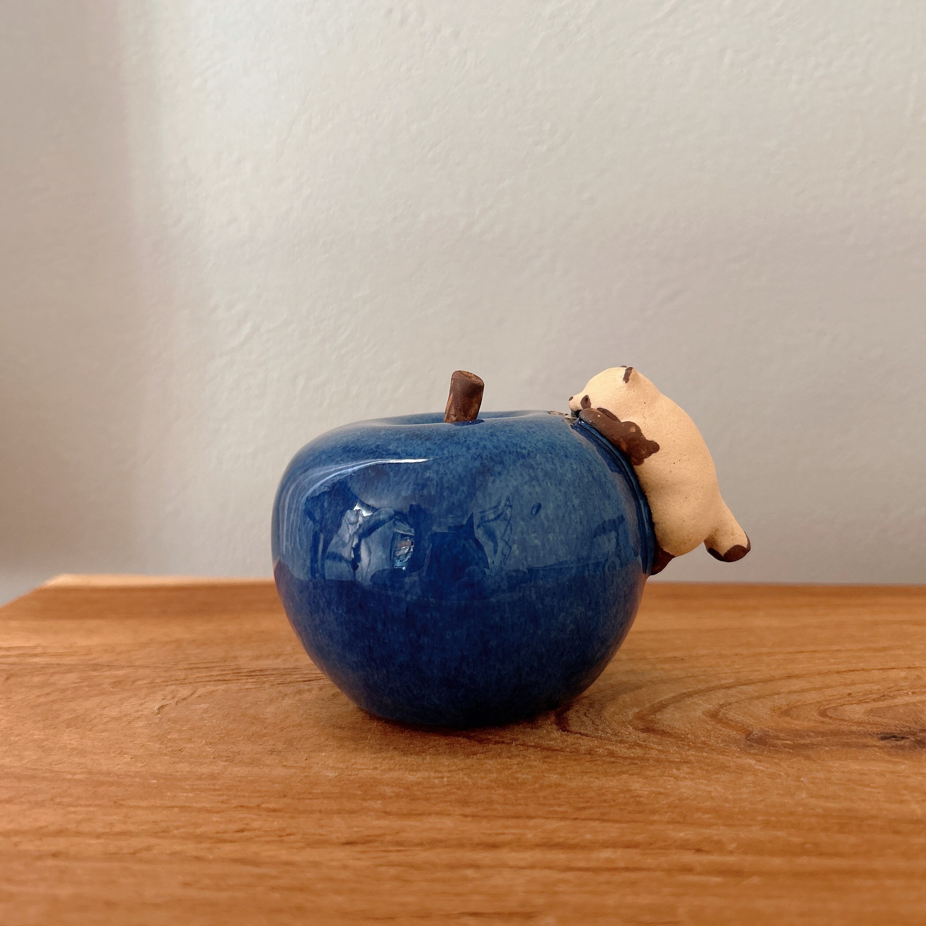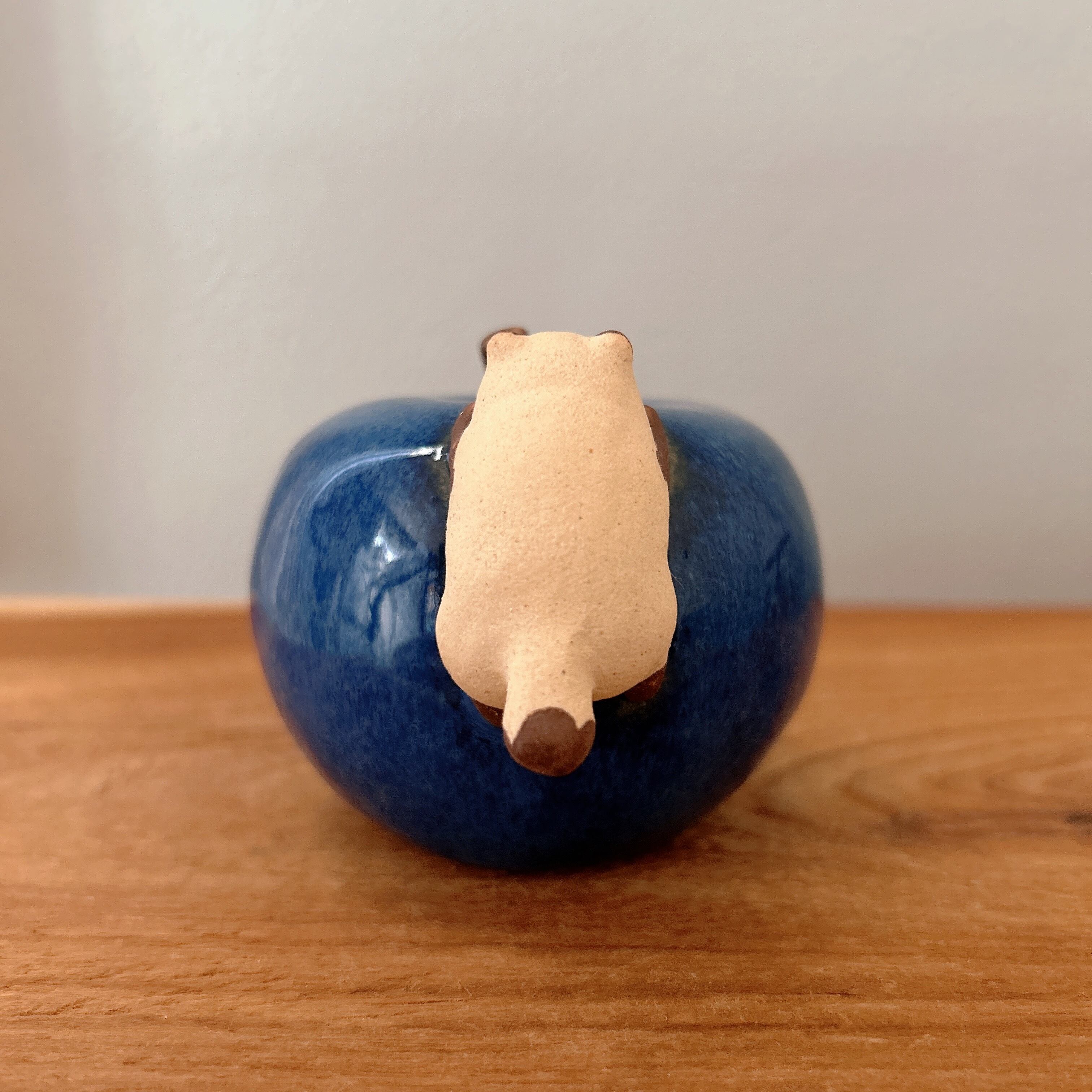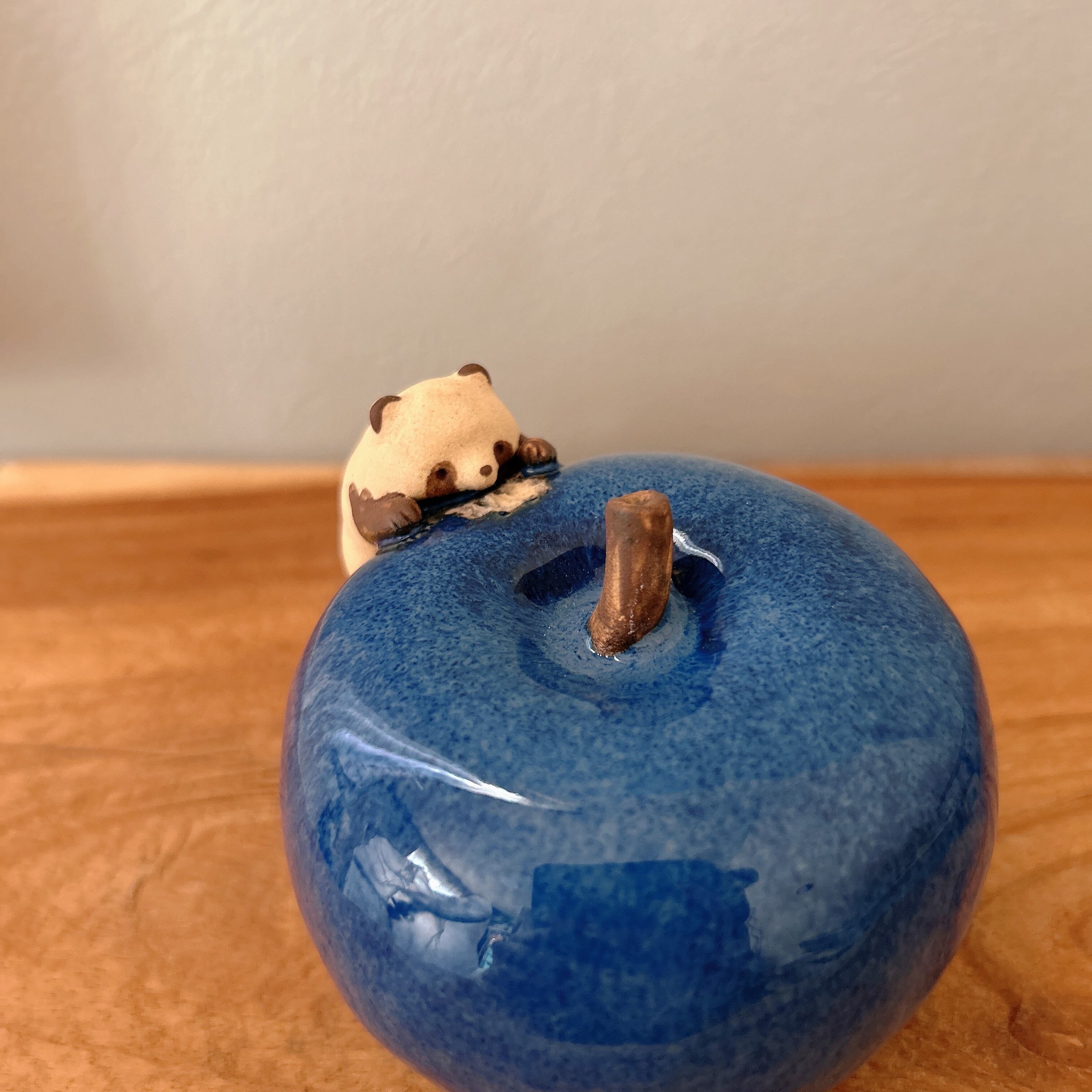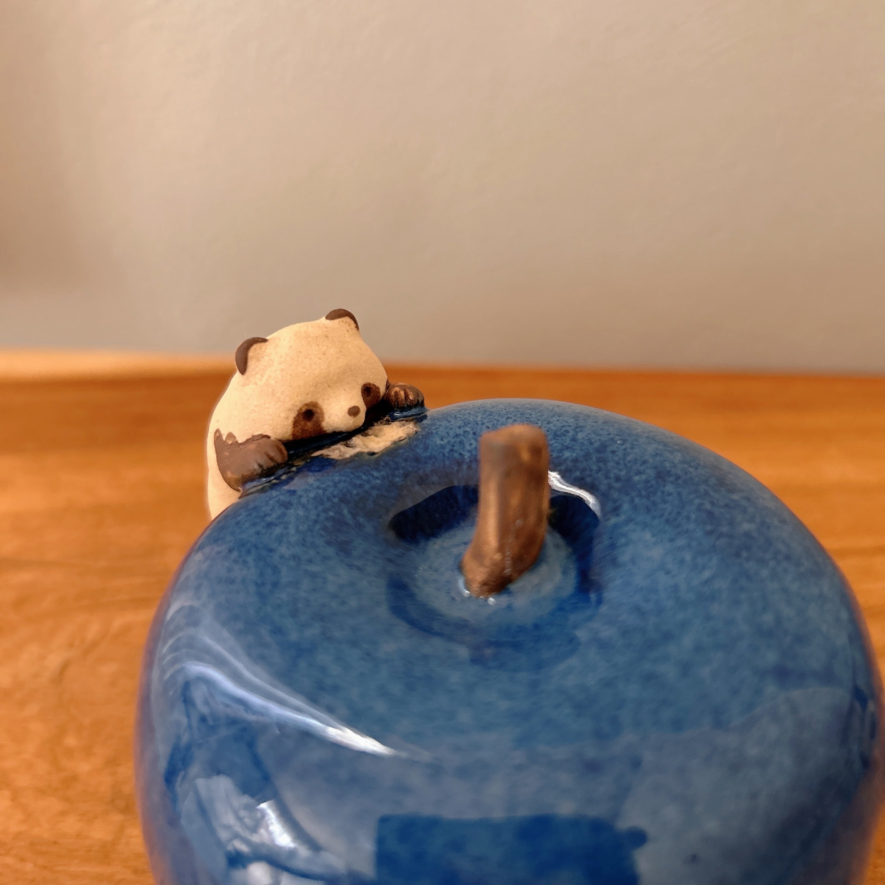 青いりんごに齧り付く小さなたぬきの置き物です。