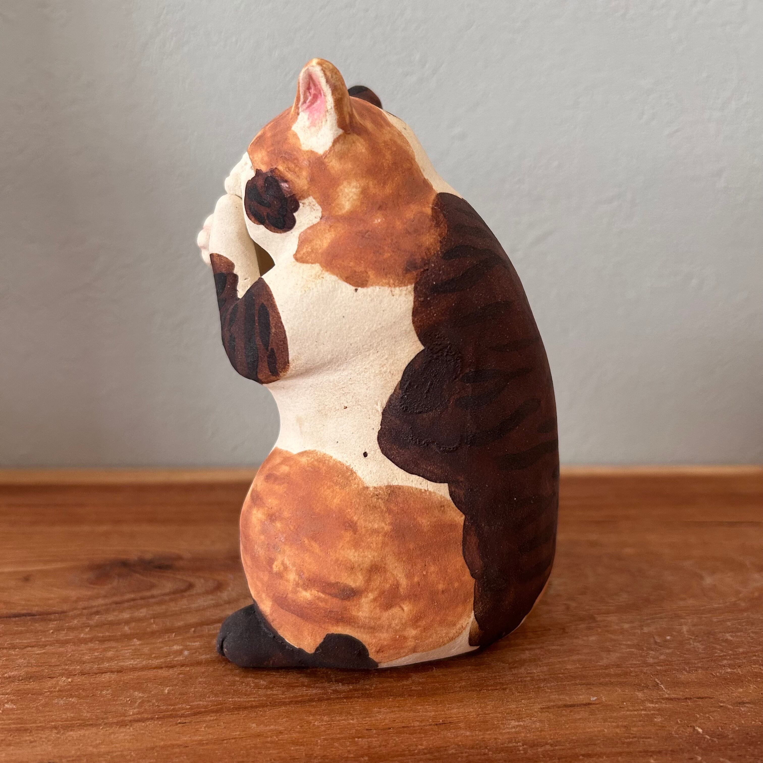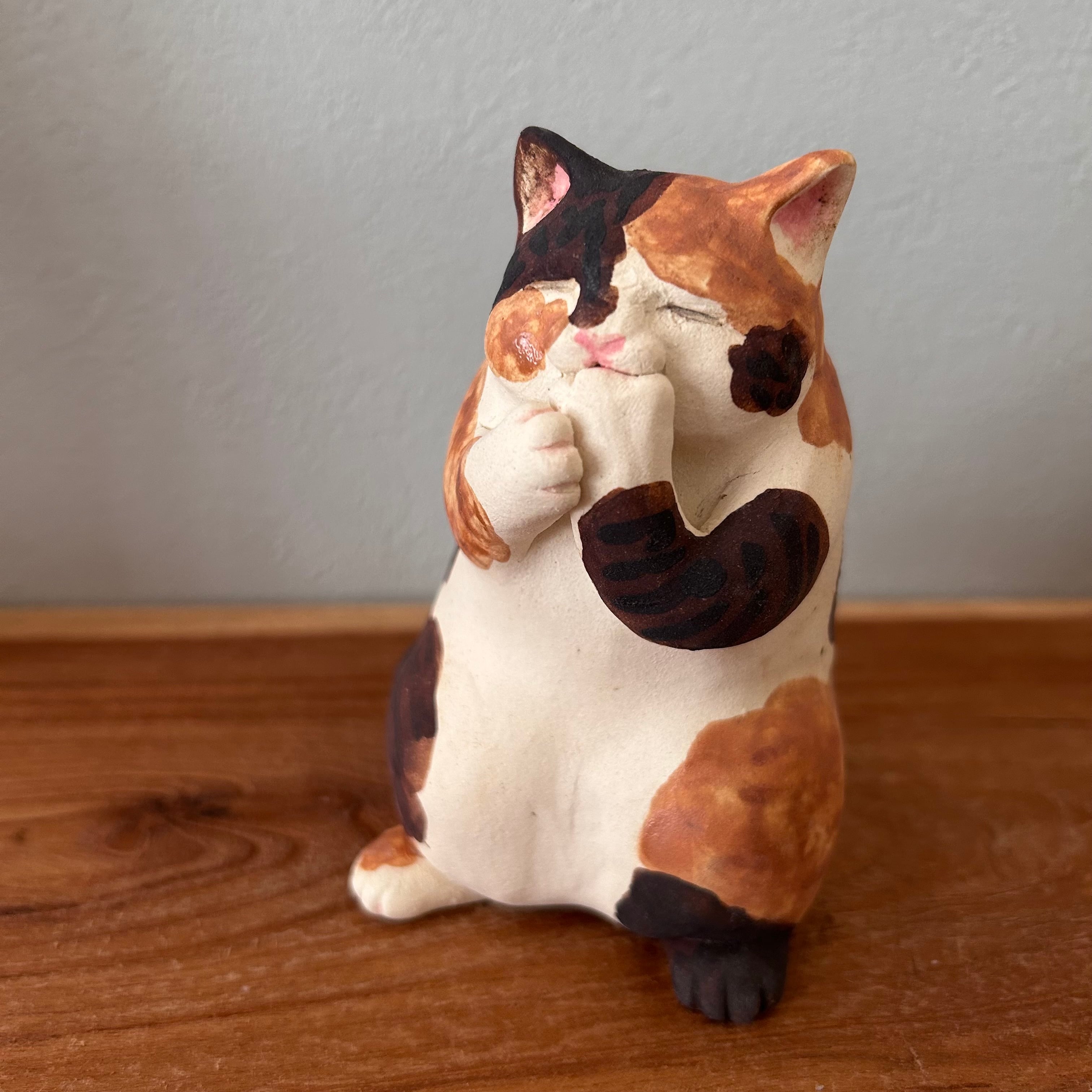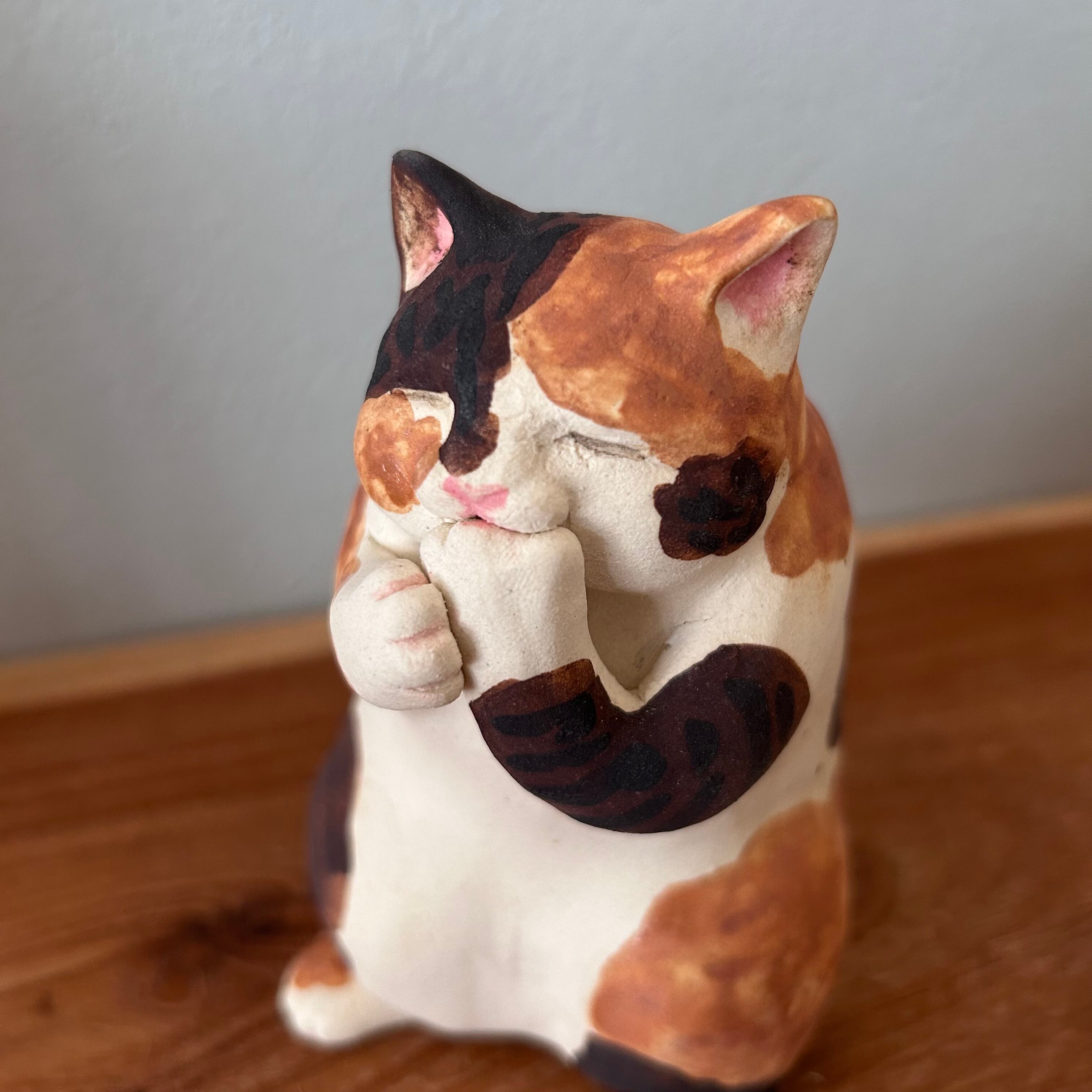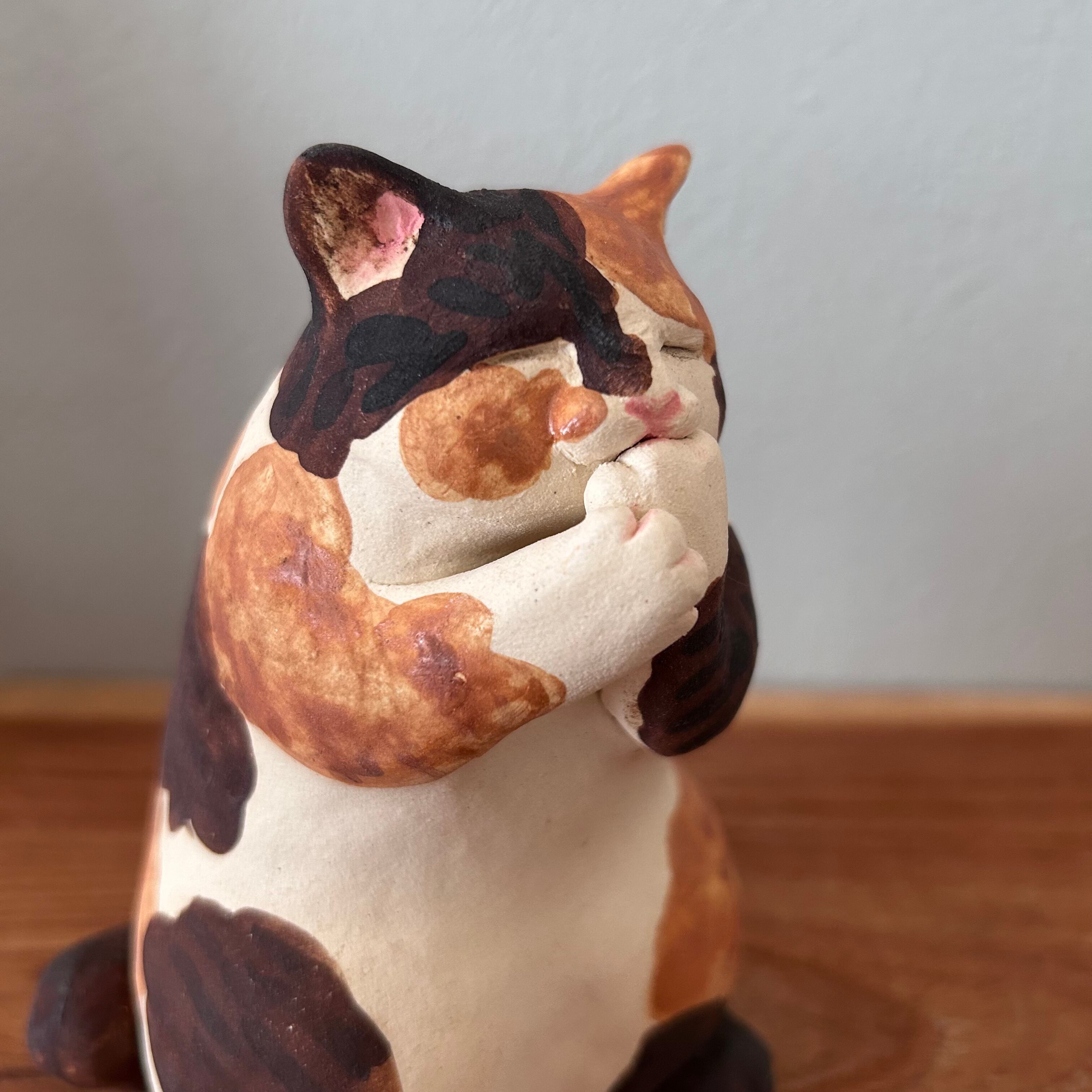 三毛猫が夢中で肉球を吸う様子を形にしました