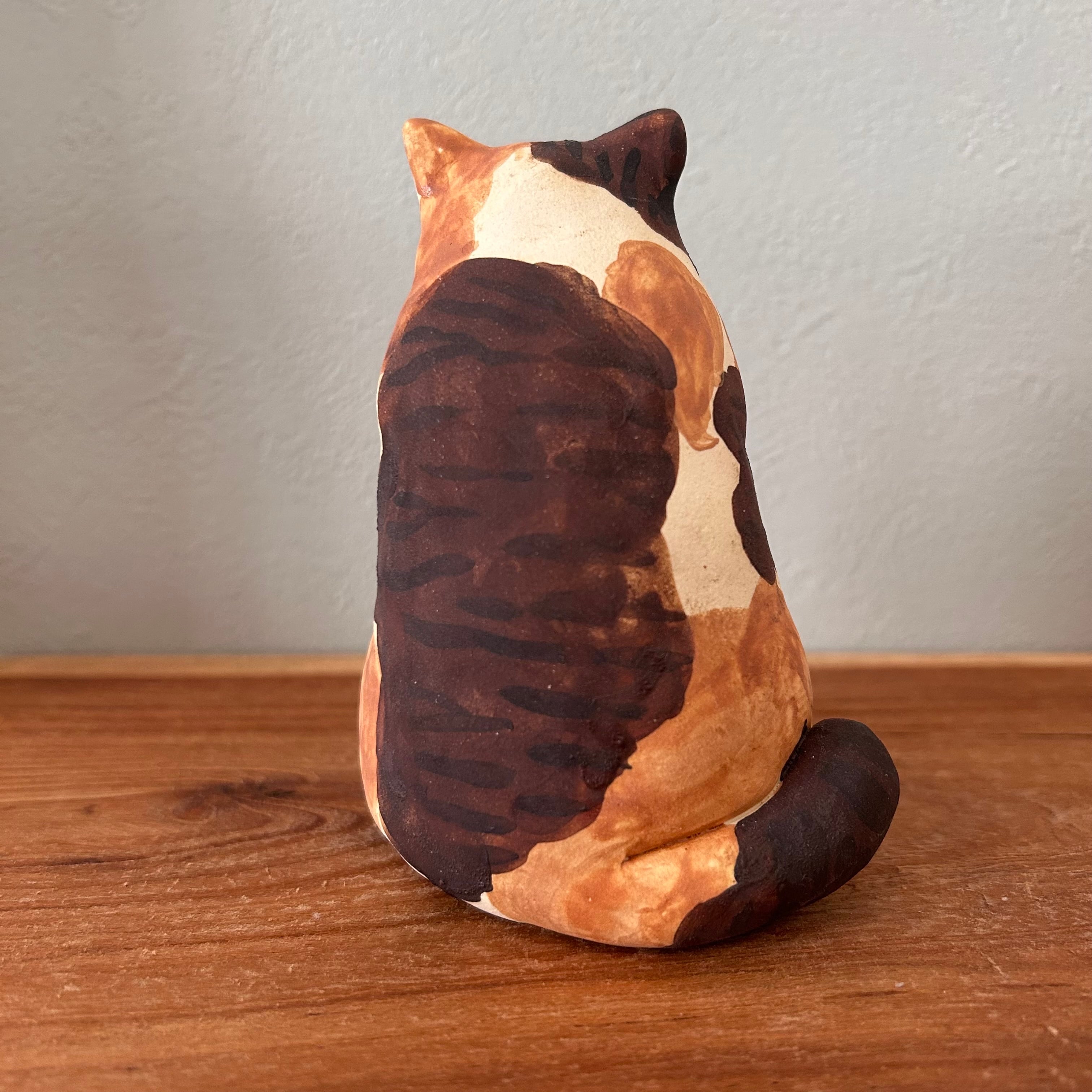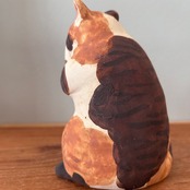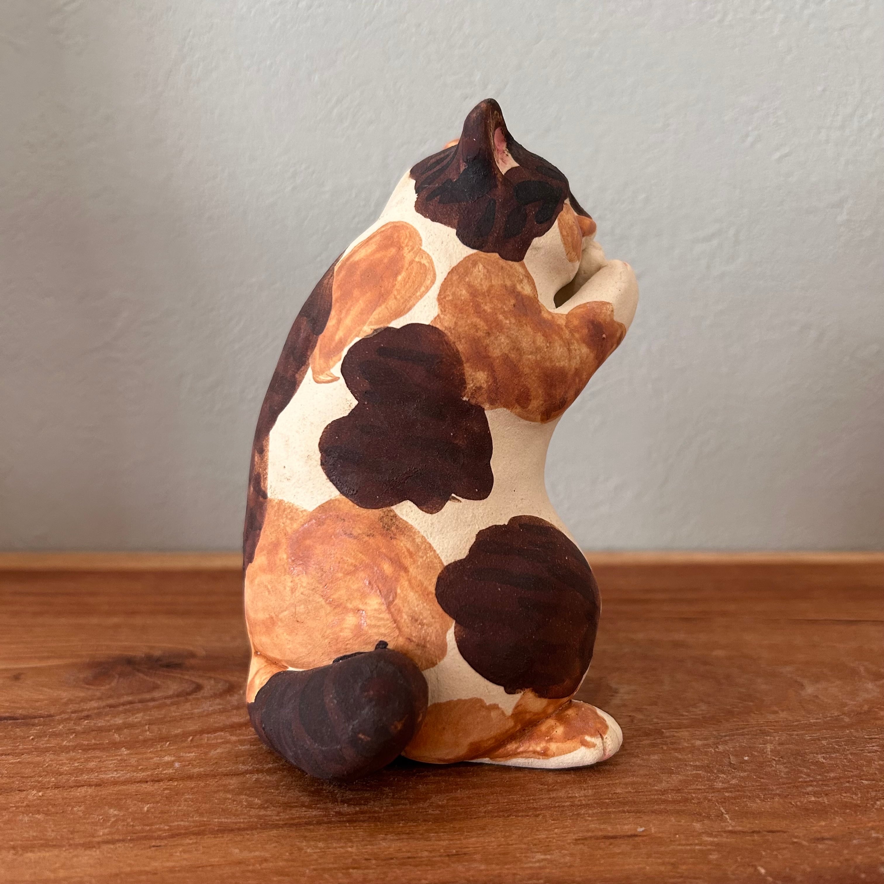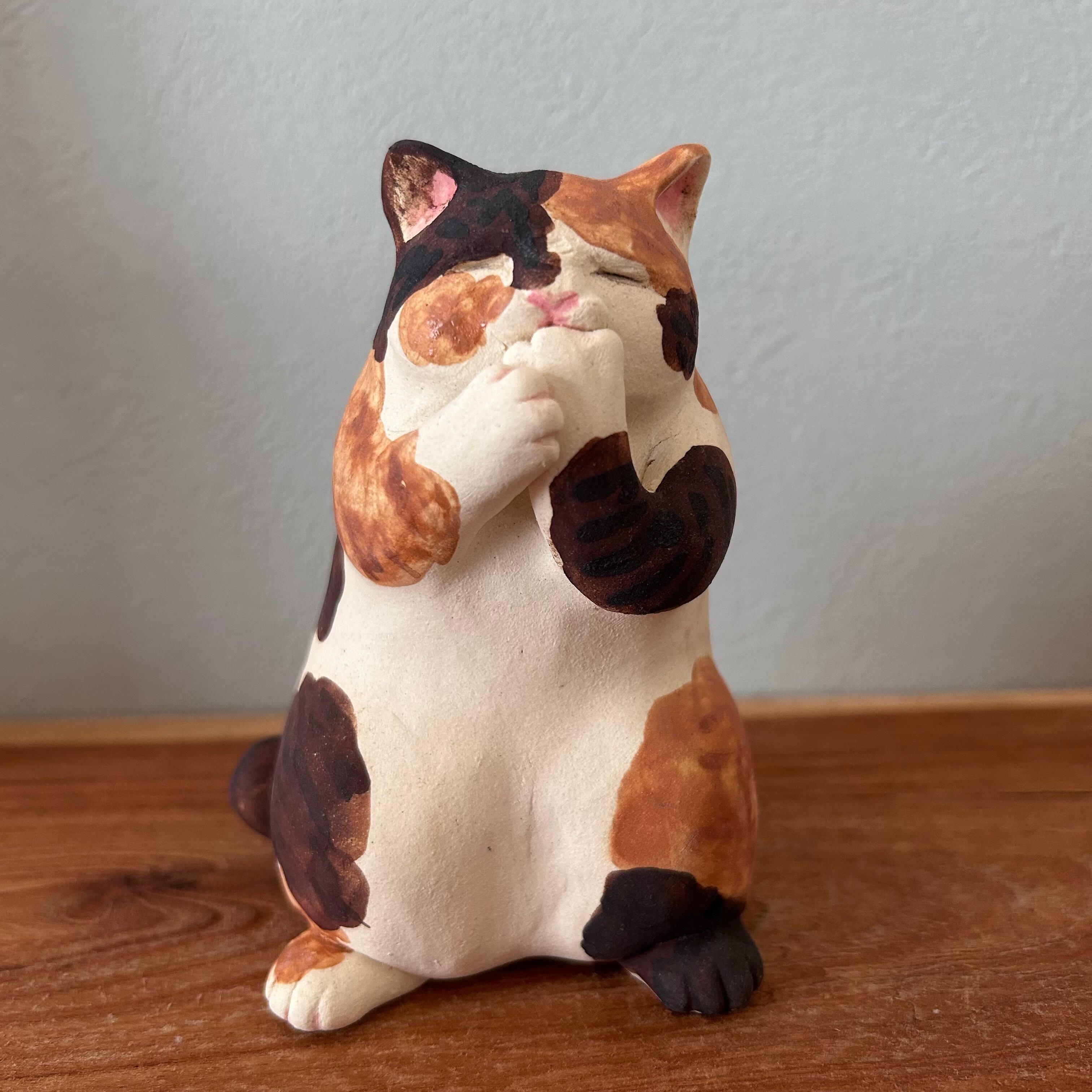 三毛猫が夢中で肉球を吸う様子を形にしました