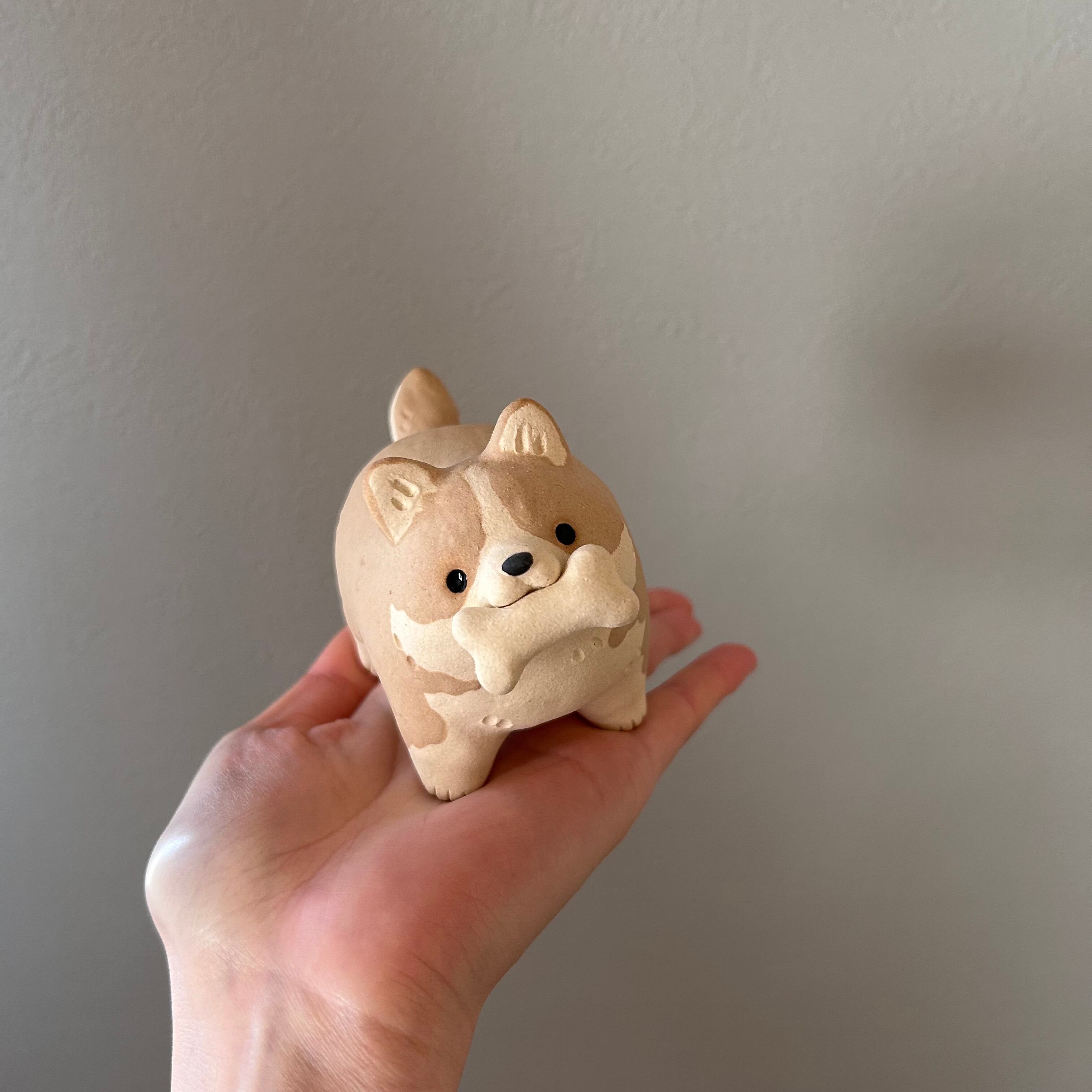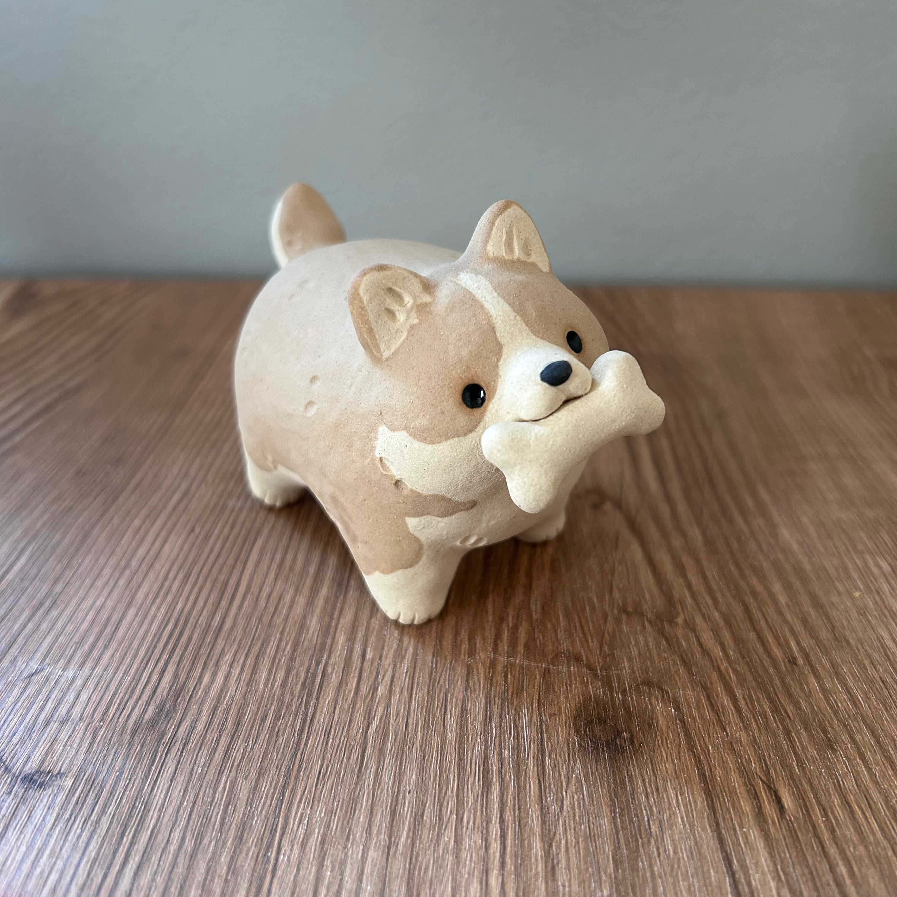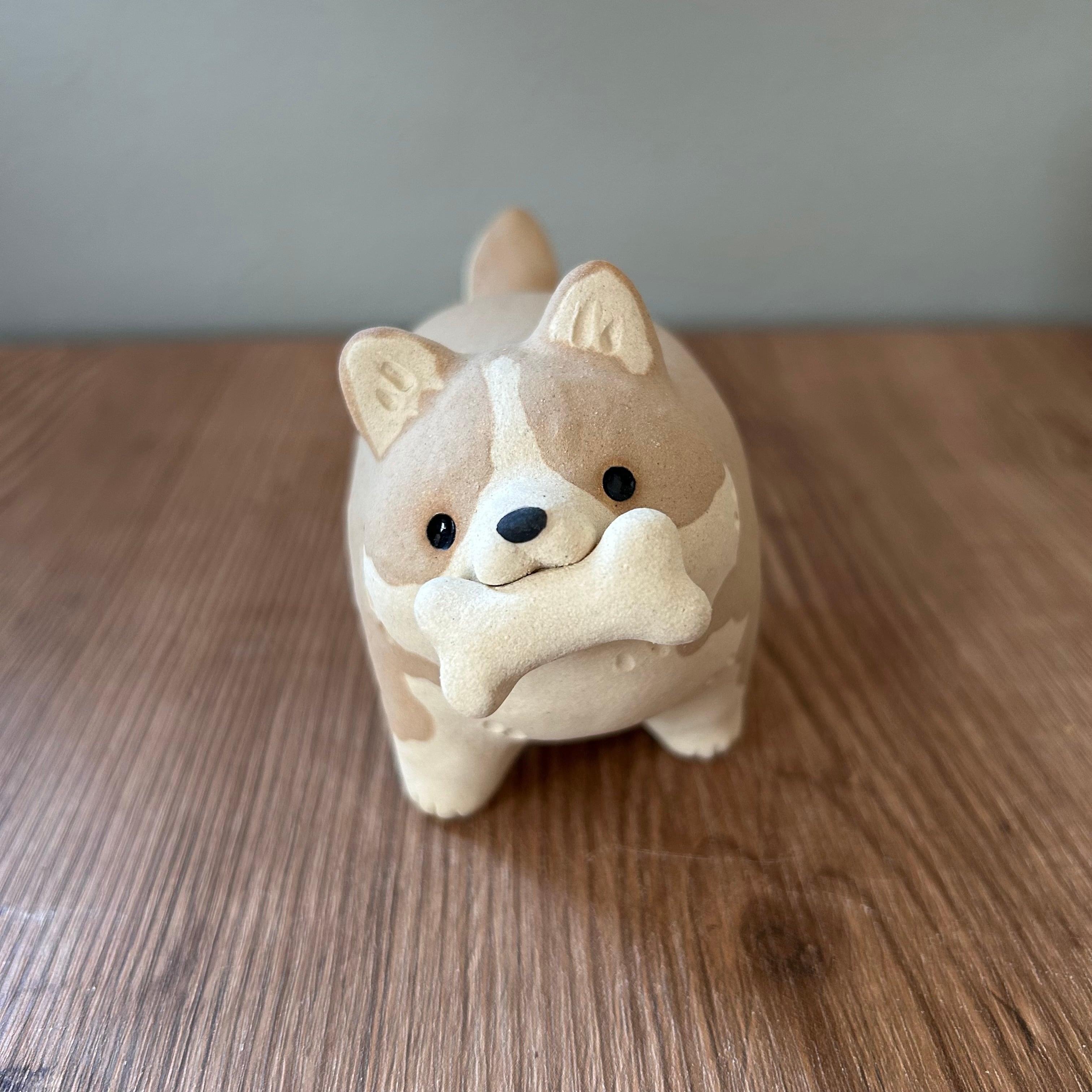 立派なほねを咥えて自慢げに走り寄ってくる犬の置き物です。