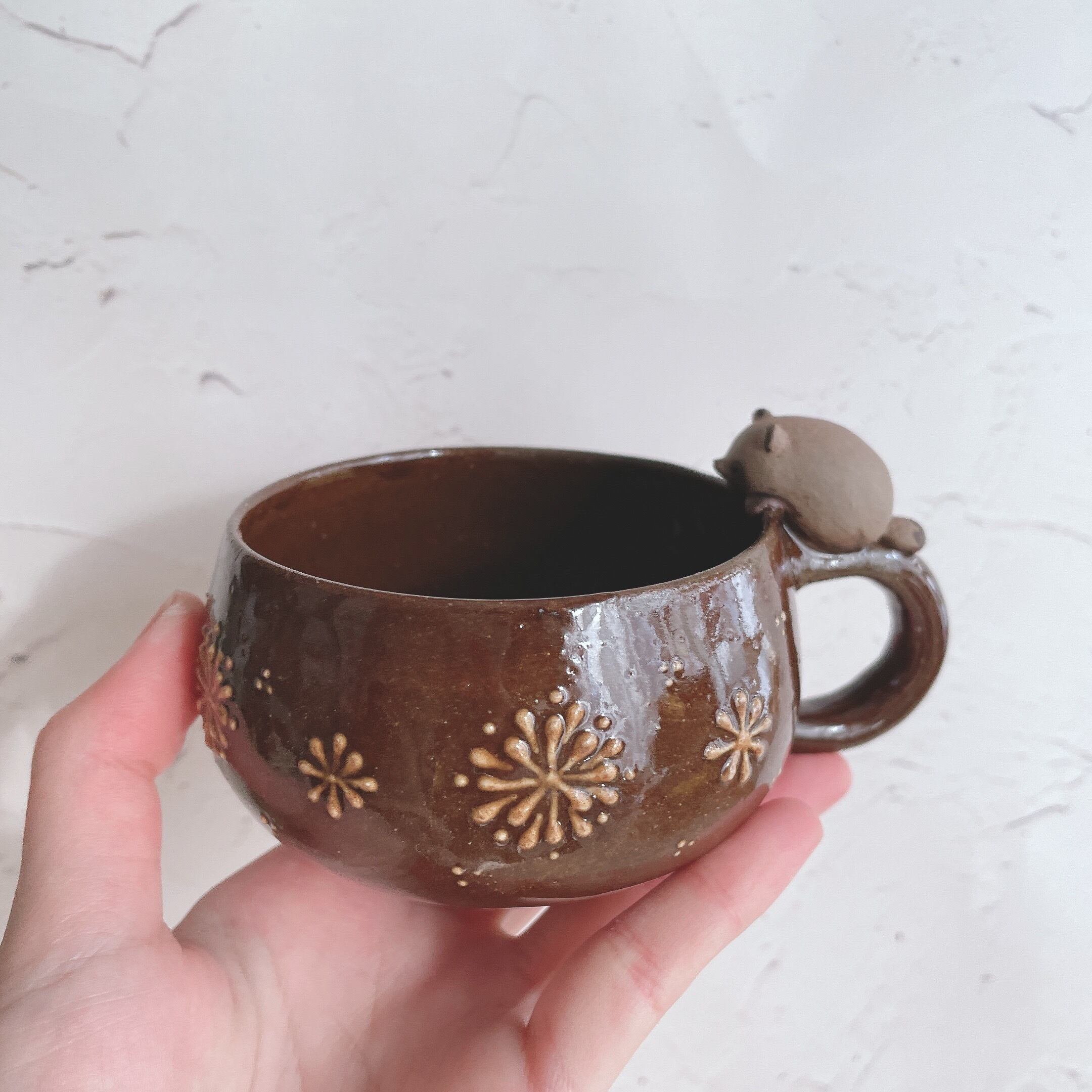 マグカップ部分にはいっちん技法を用いて一つ一つ異なる模様を描いるため、どれも一点ものとなっております。