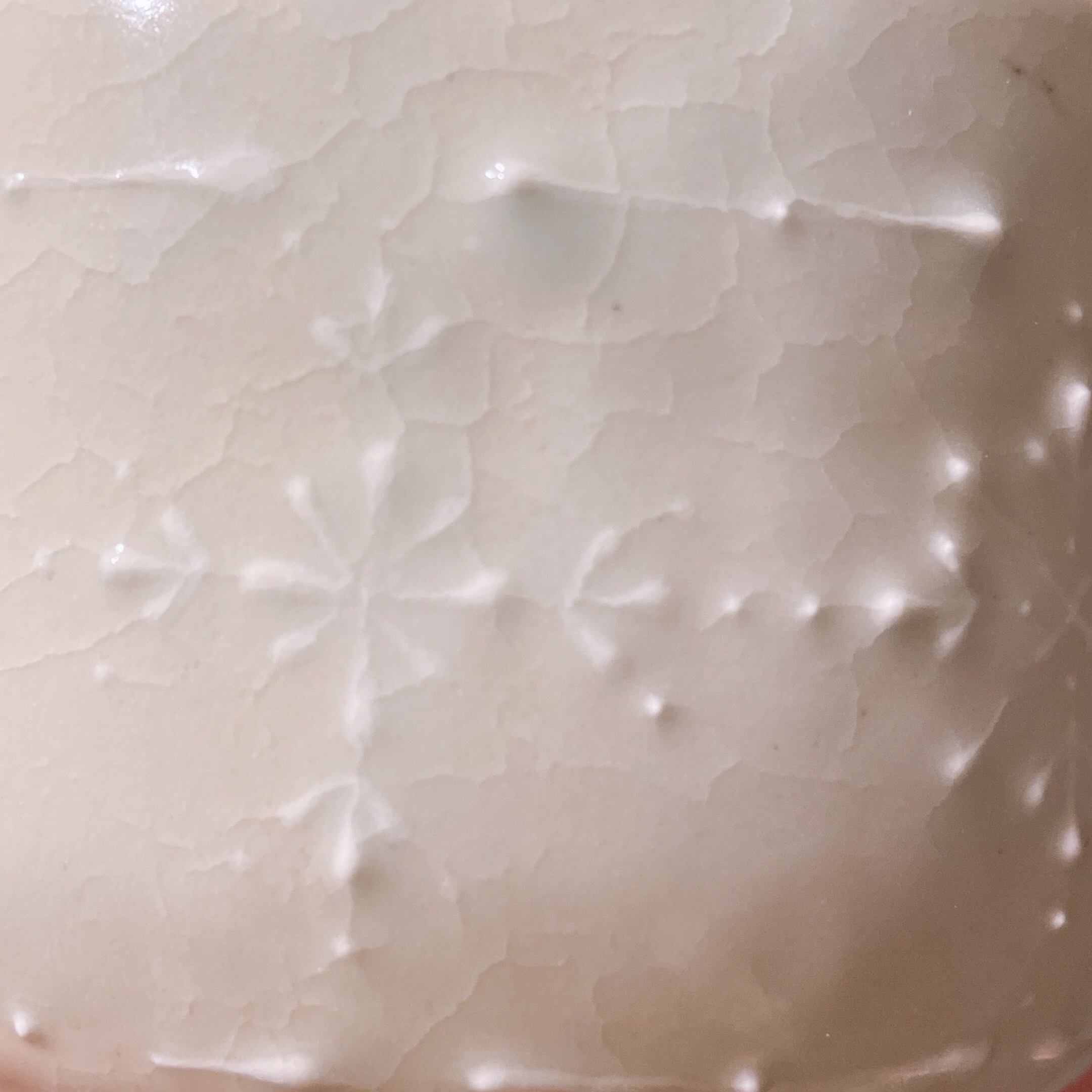 雪の結晶をモチーフにした柄を描き、少し青みがかった透明の釉薬をかけて仕上げました。冬にぴったりな色合いでこれからの季節におすすめです。