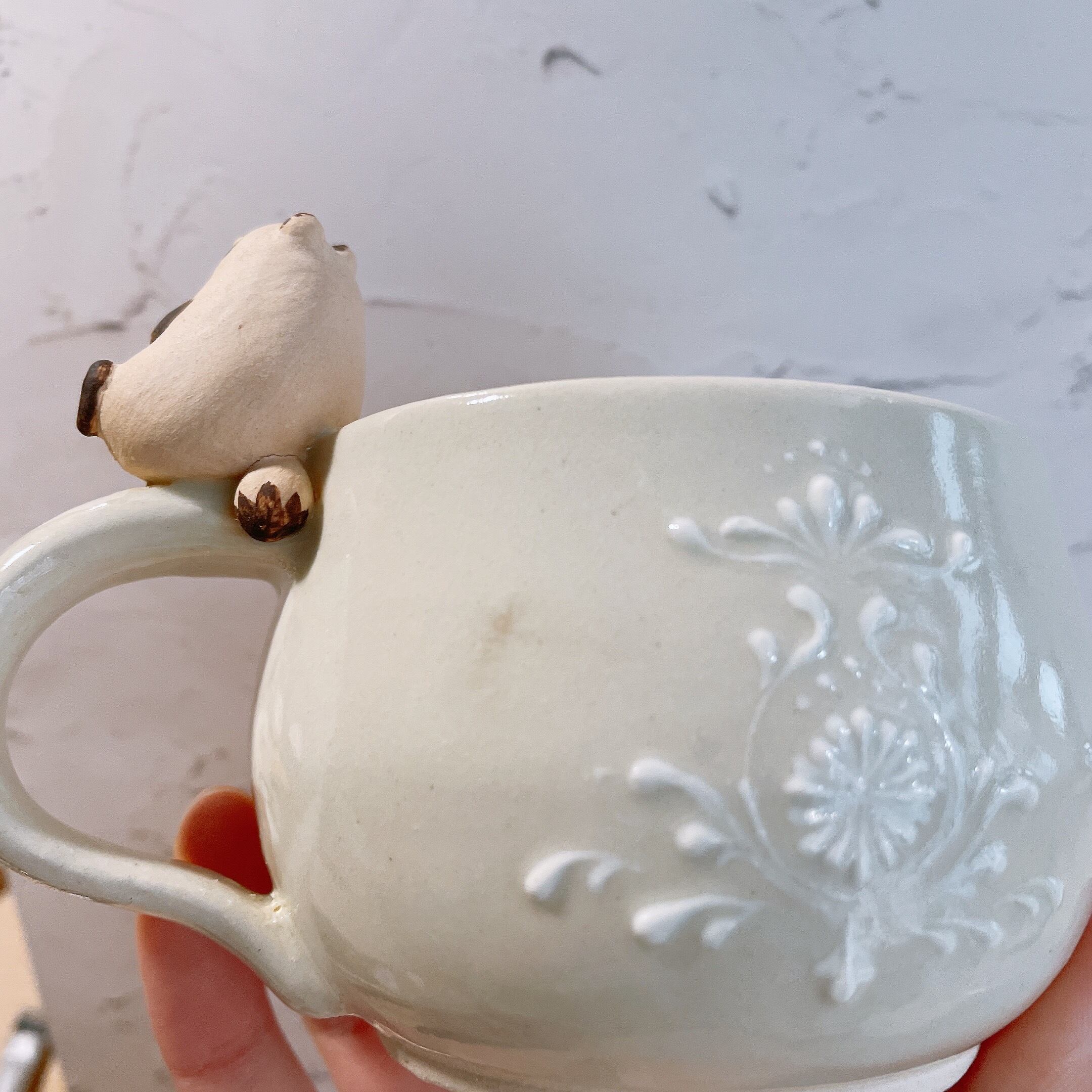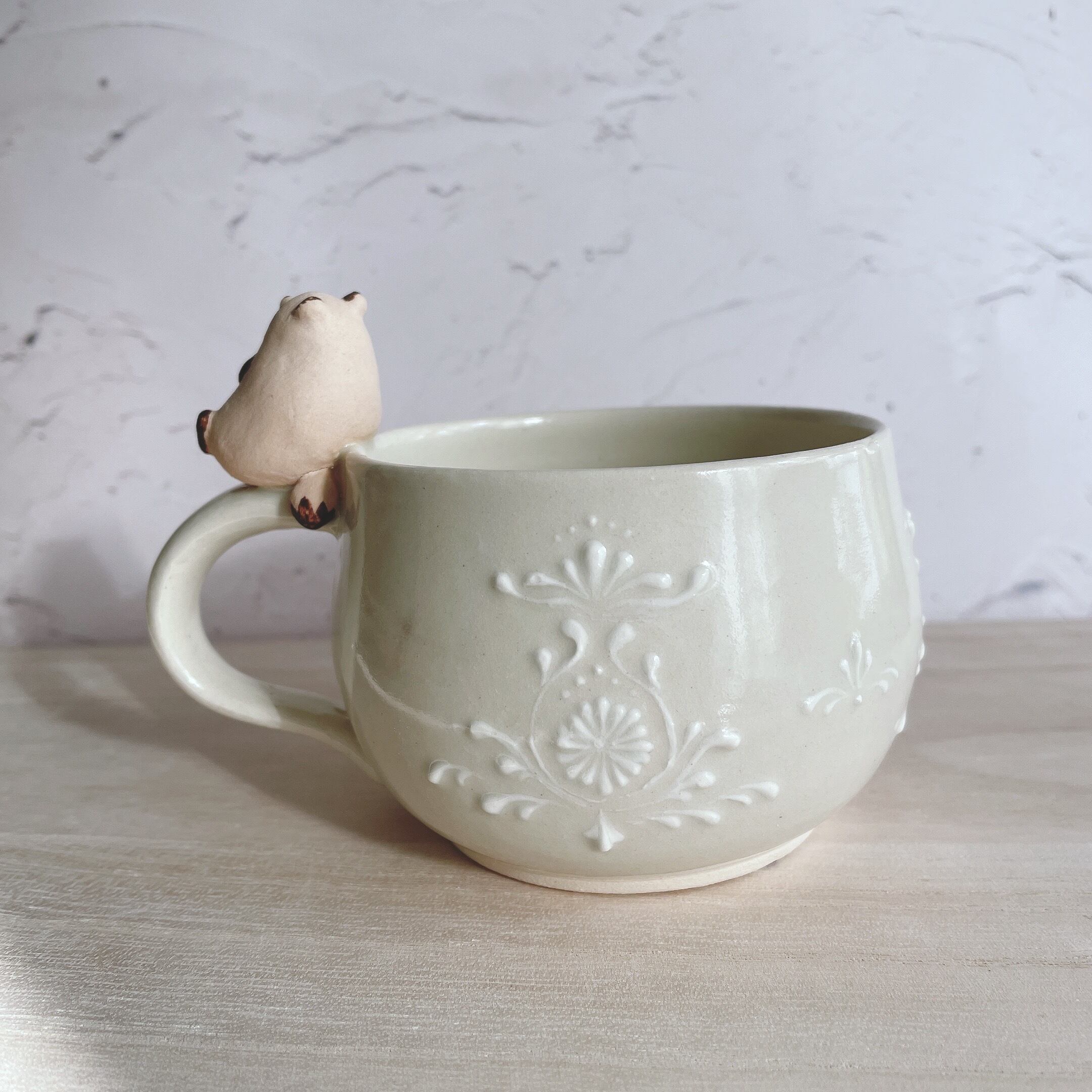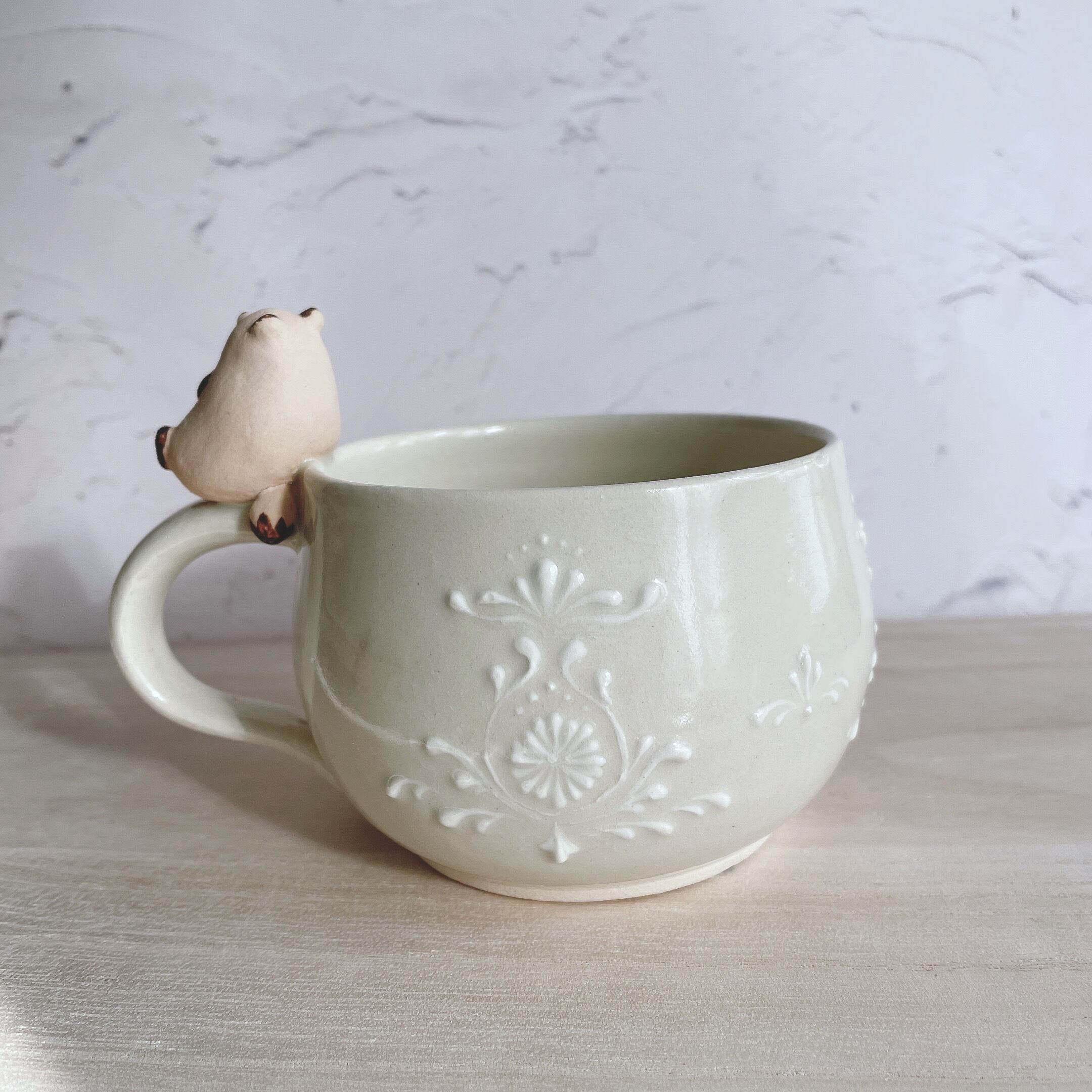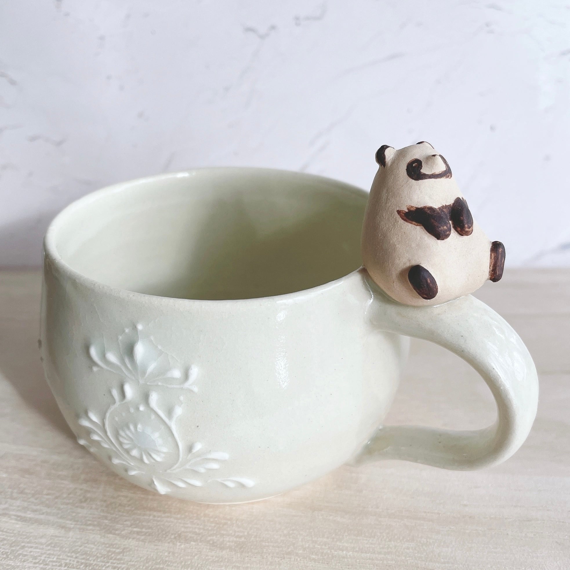 マグカップ部分にはいっちん技法を用いて一つ一つ異なる模様を描いるため、どれも一点ものとなっております。