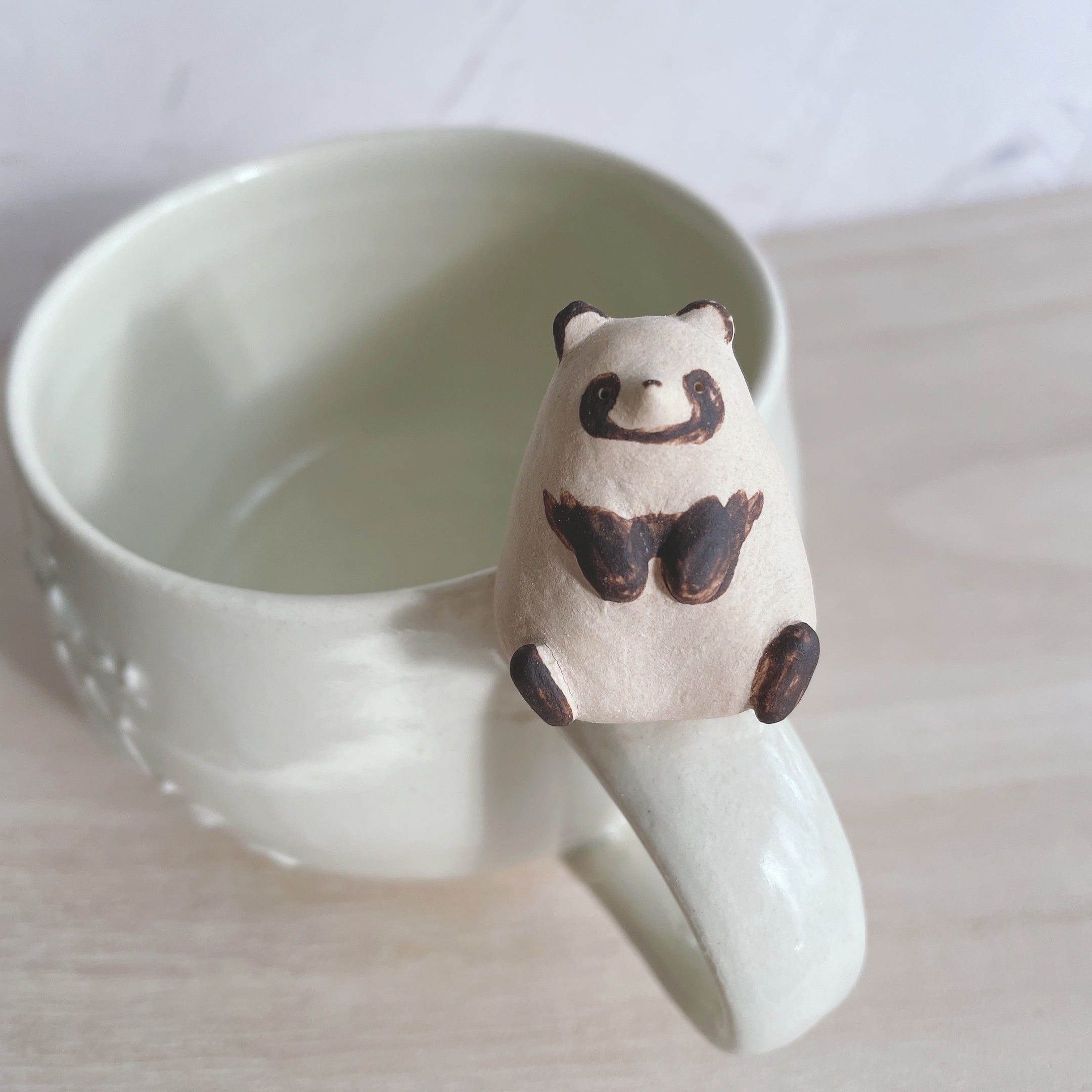 持ち手にもちっと座って空を見上げるたぬきのマグカップです。