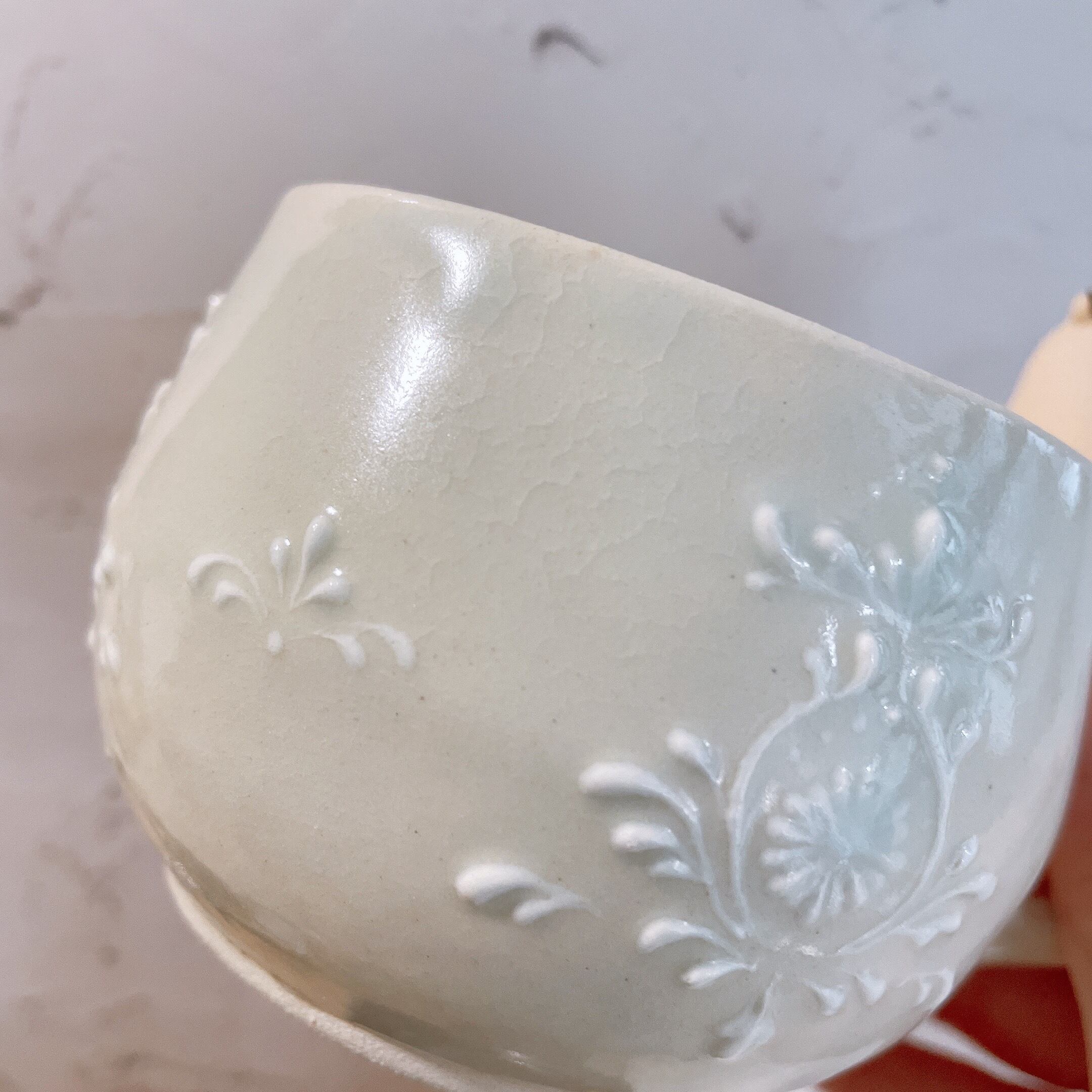 いっちんと呼ばれる技法で柄を描き、少し青みがかった透明の釉薬をかけて仕上げました。冬にぴったりな色合いでこれからの季節におすすめです。