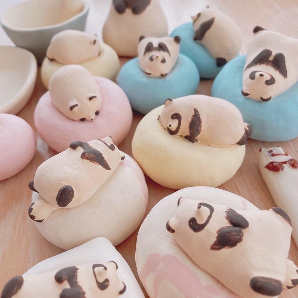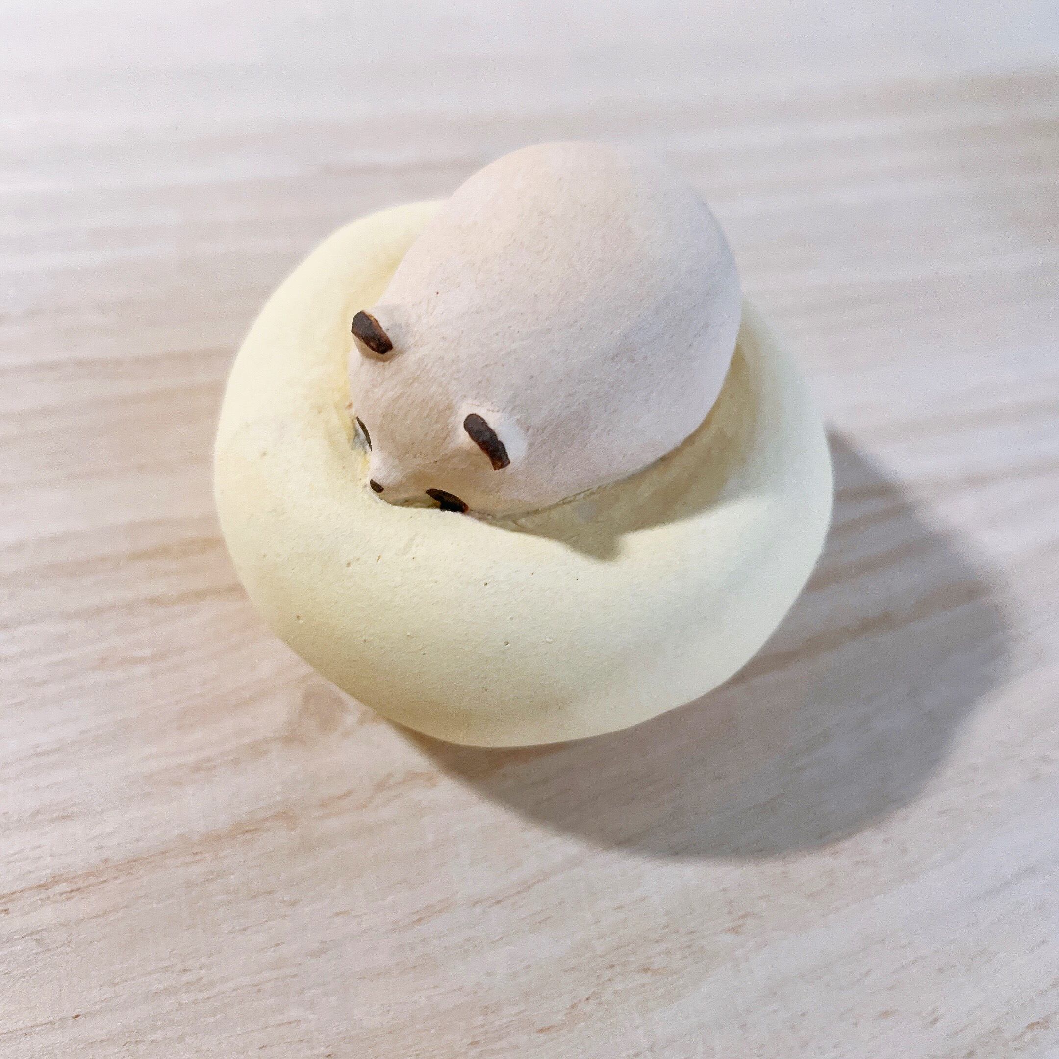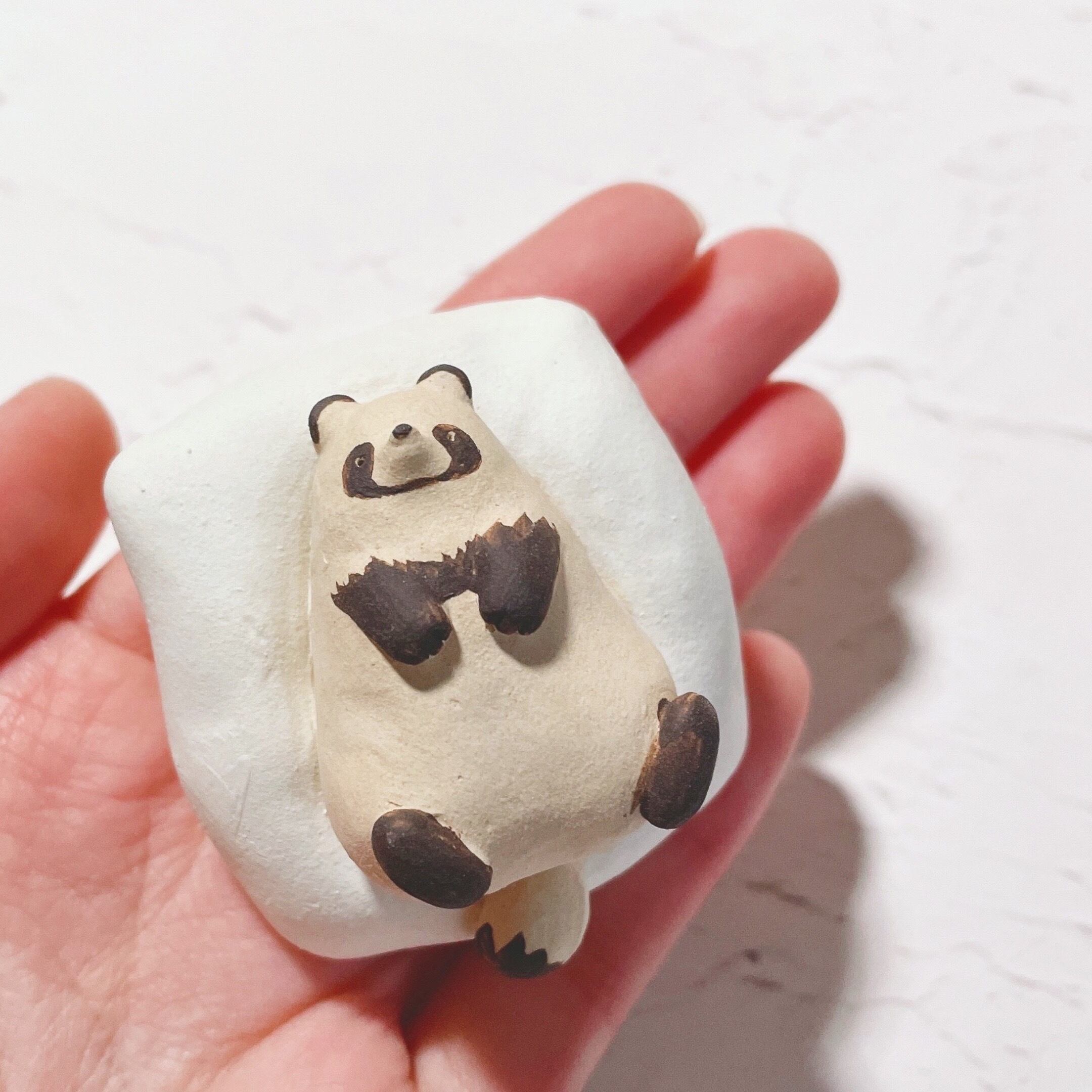 ふわふわのクッションでダメになってしまったたぬきたちの置物です。