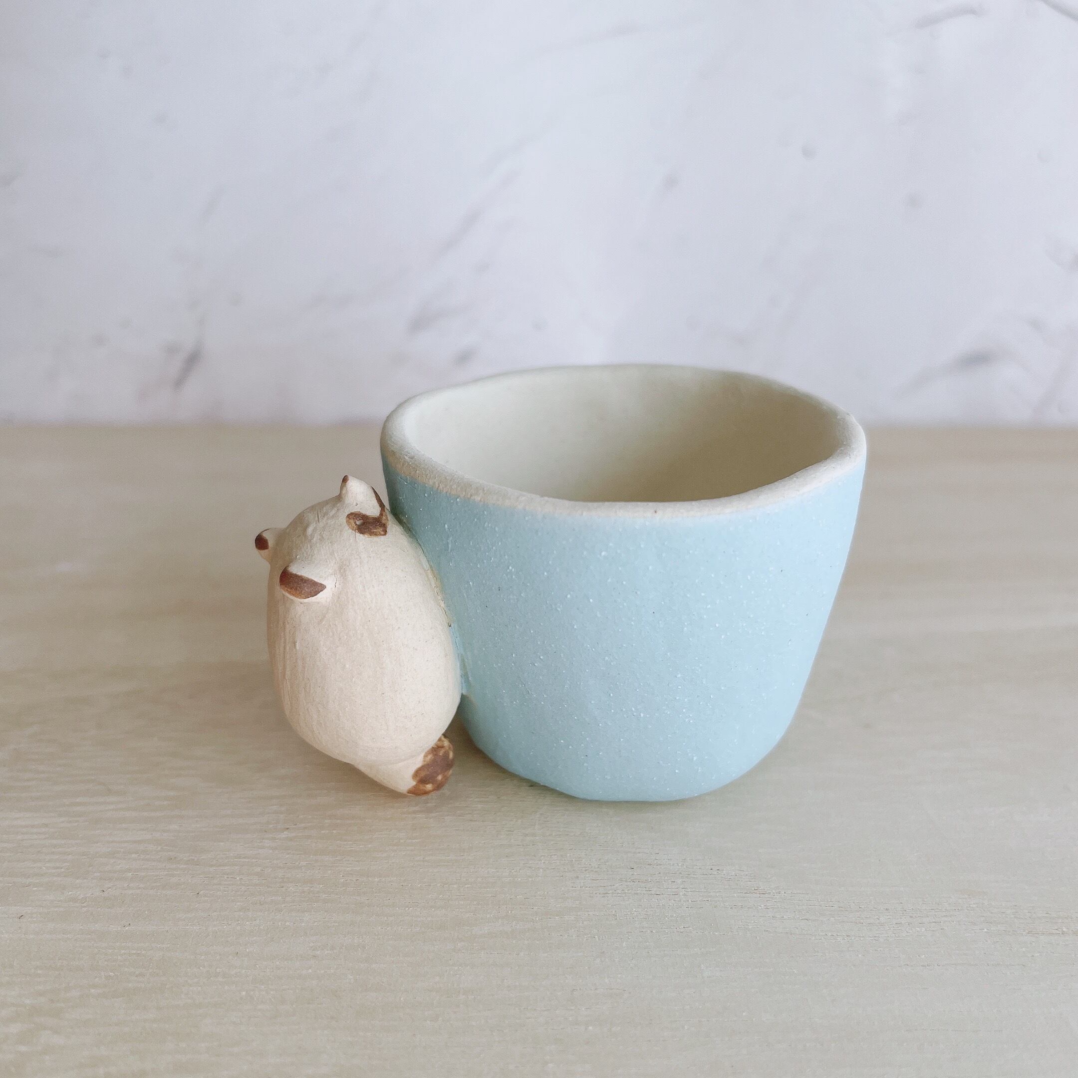 化粧泥の柔らかな青の鉢に小さなたぬきがくっついて植物たちを見守ります。