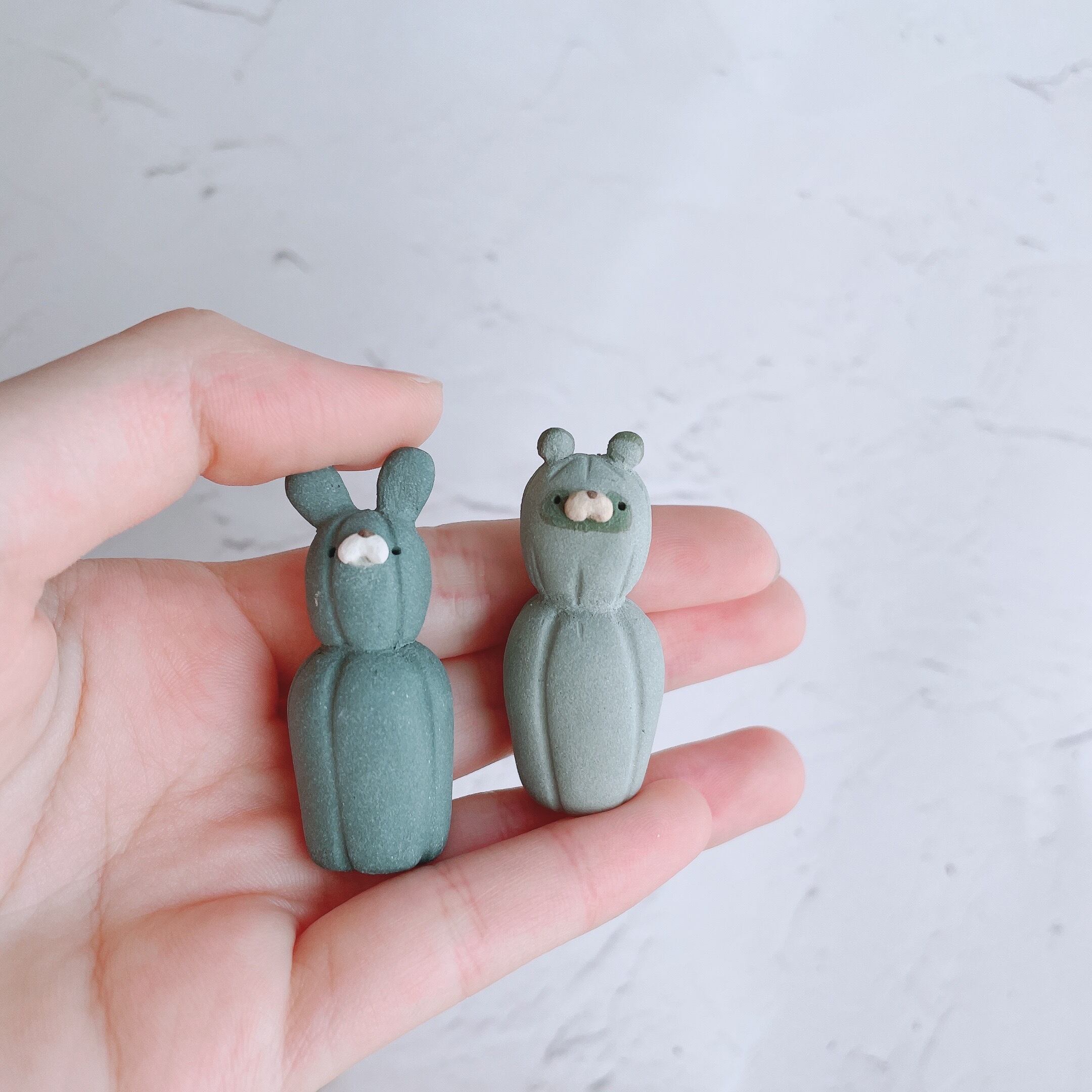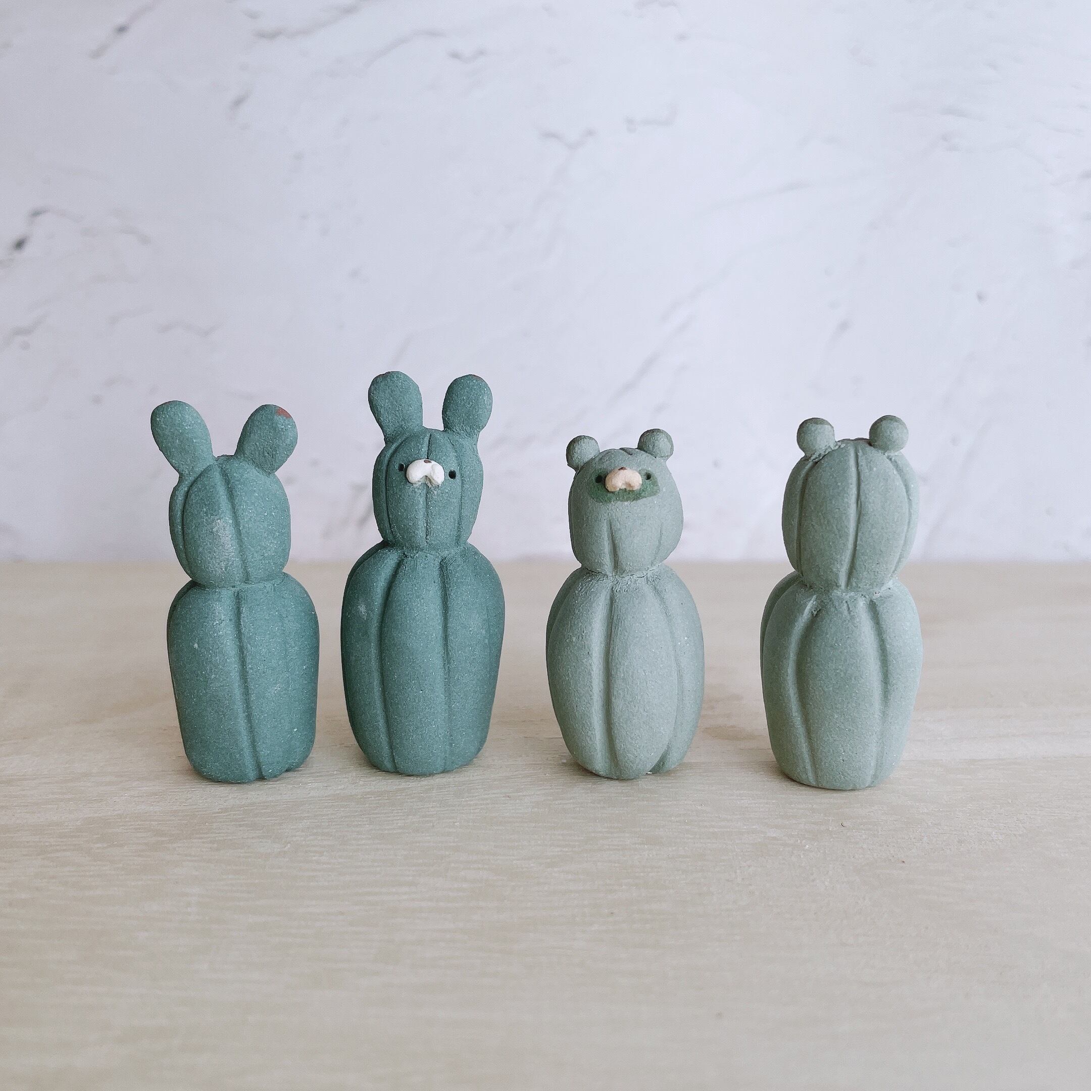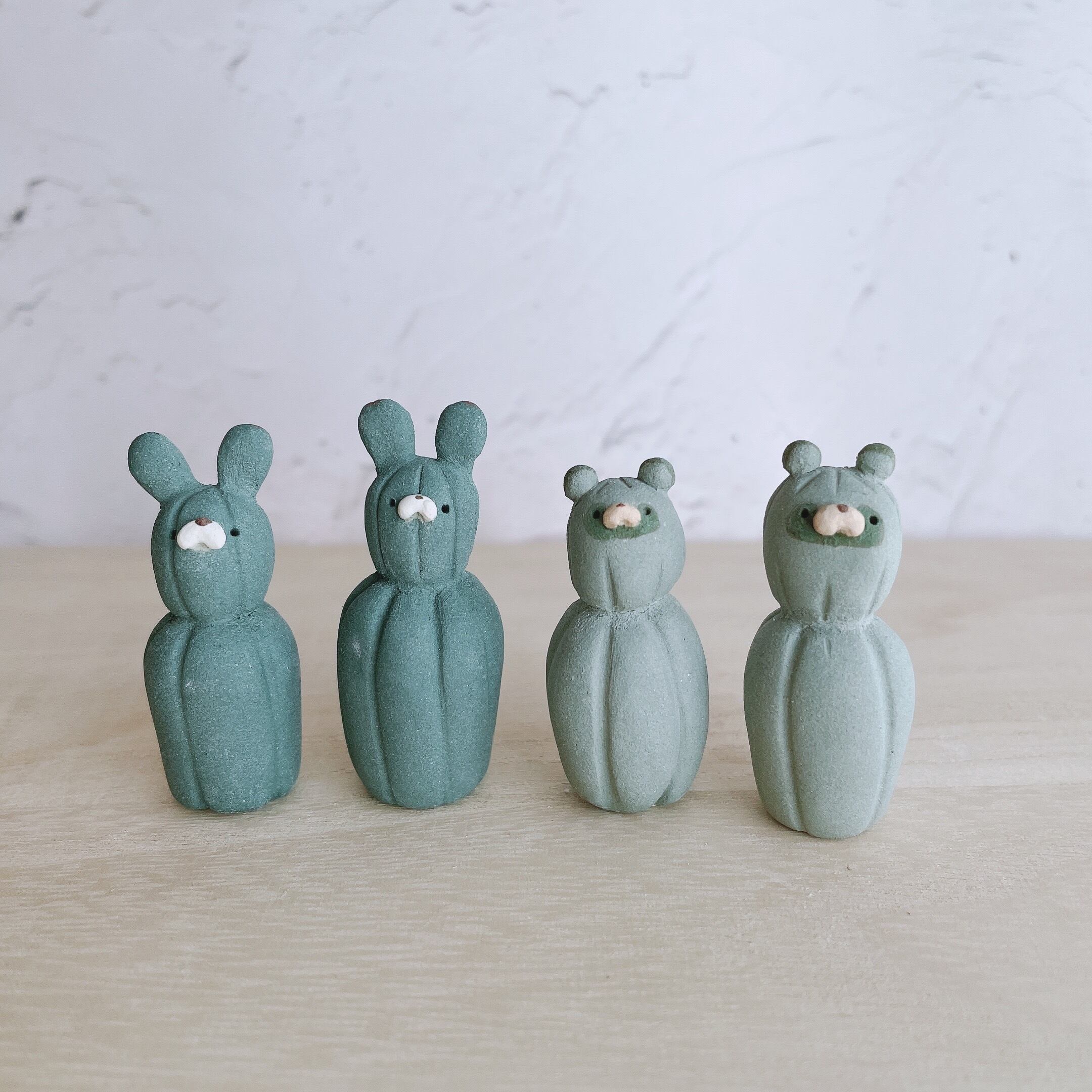 サボテンに化けたたぬきたちの置物です。