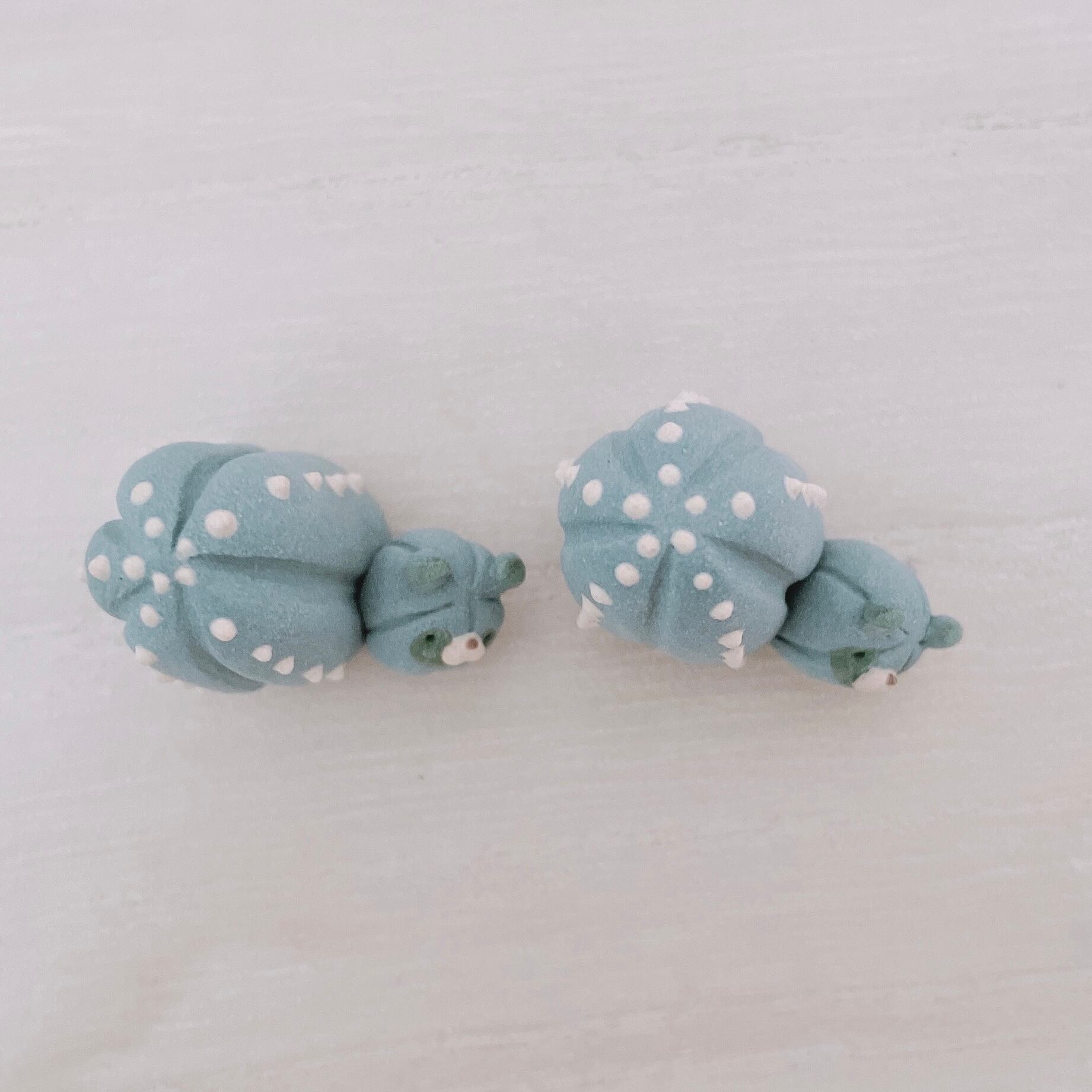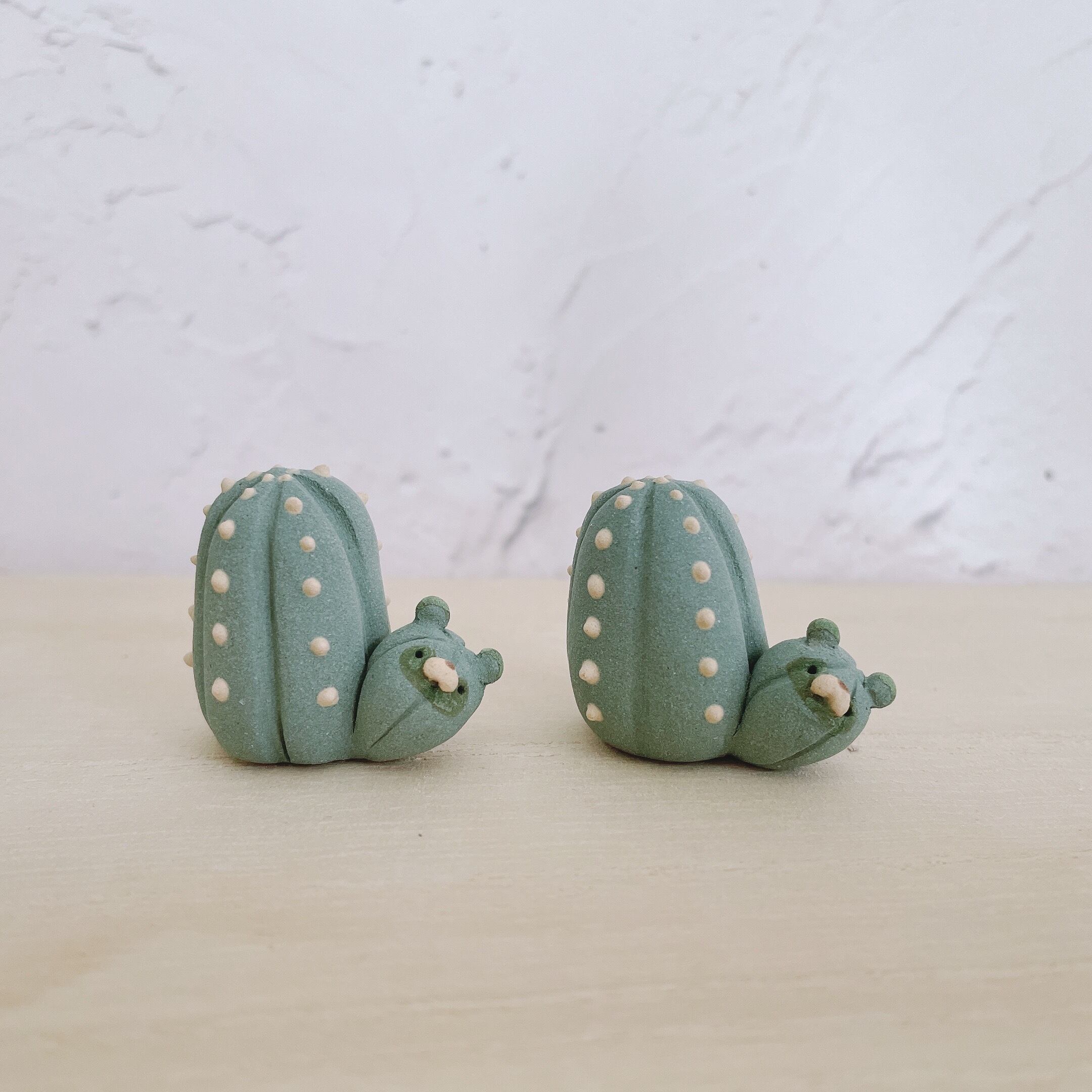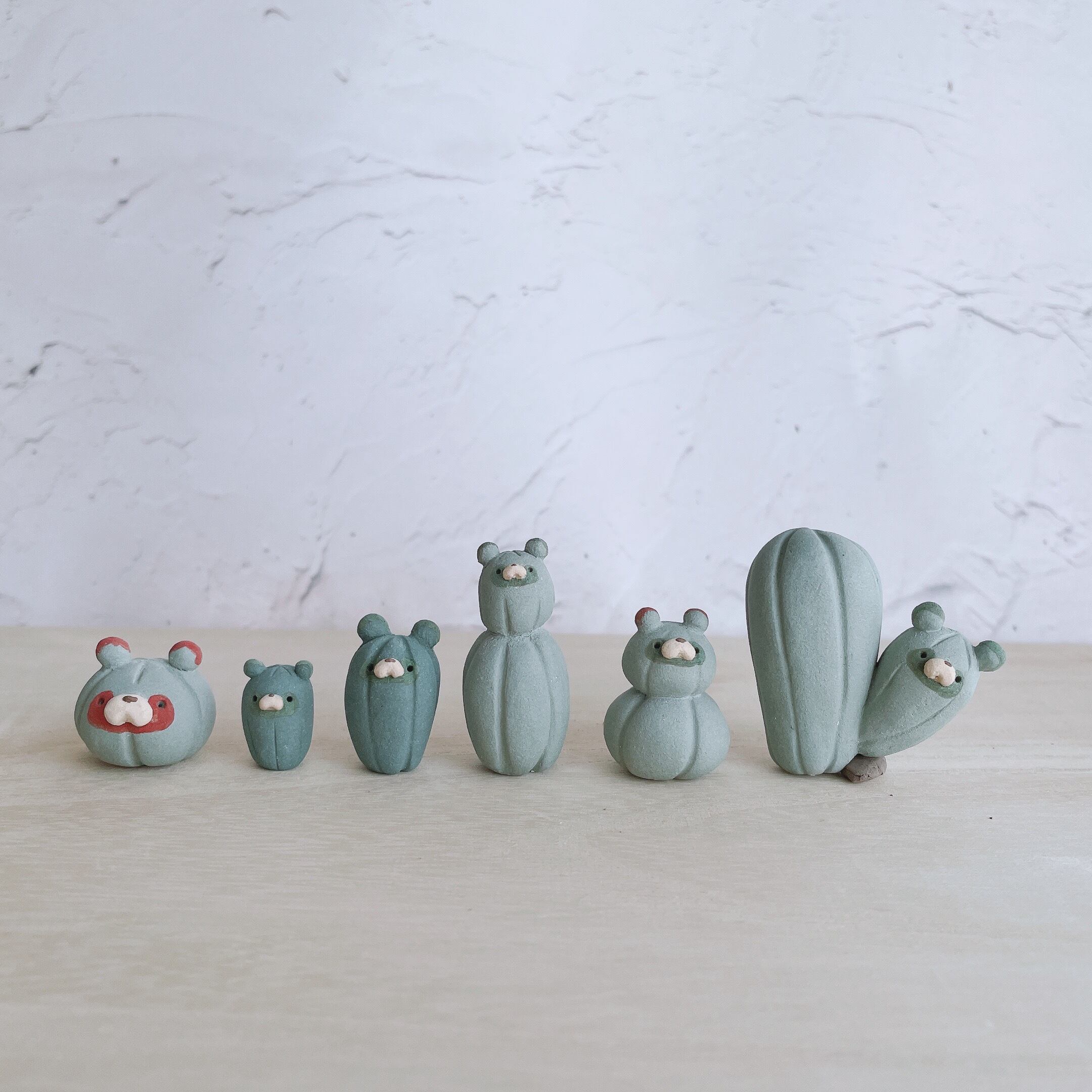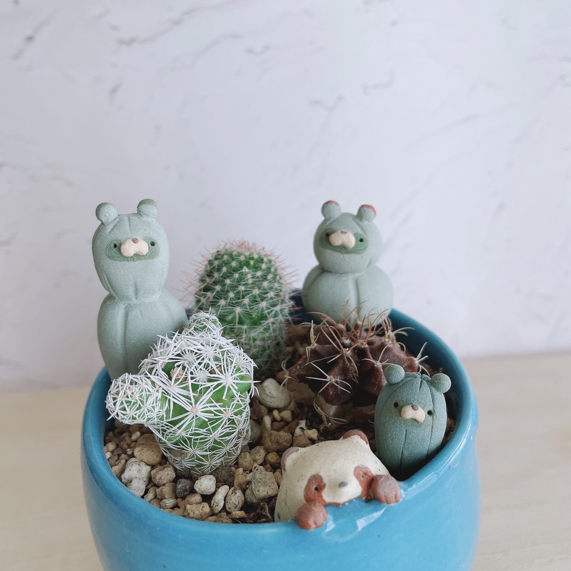 とげとげサボテンに化けたたぬきたちの置物です。