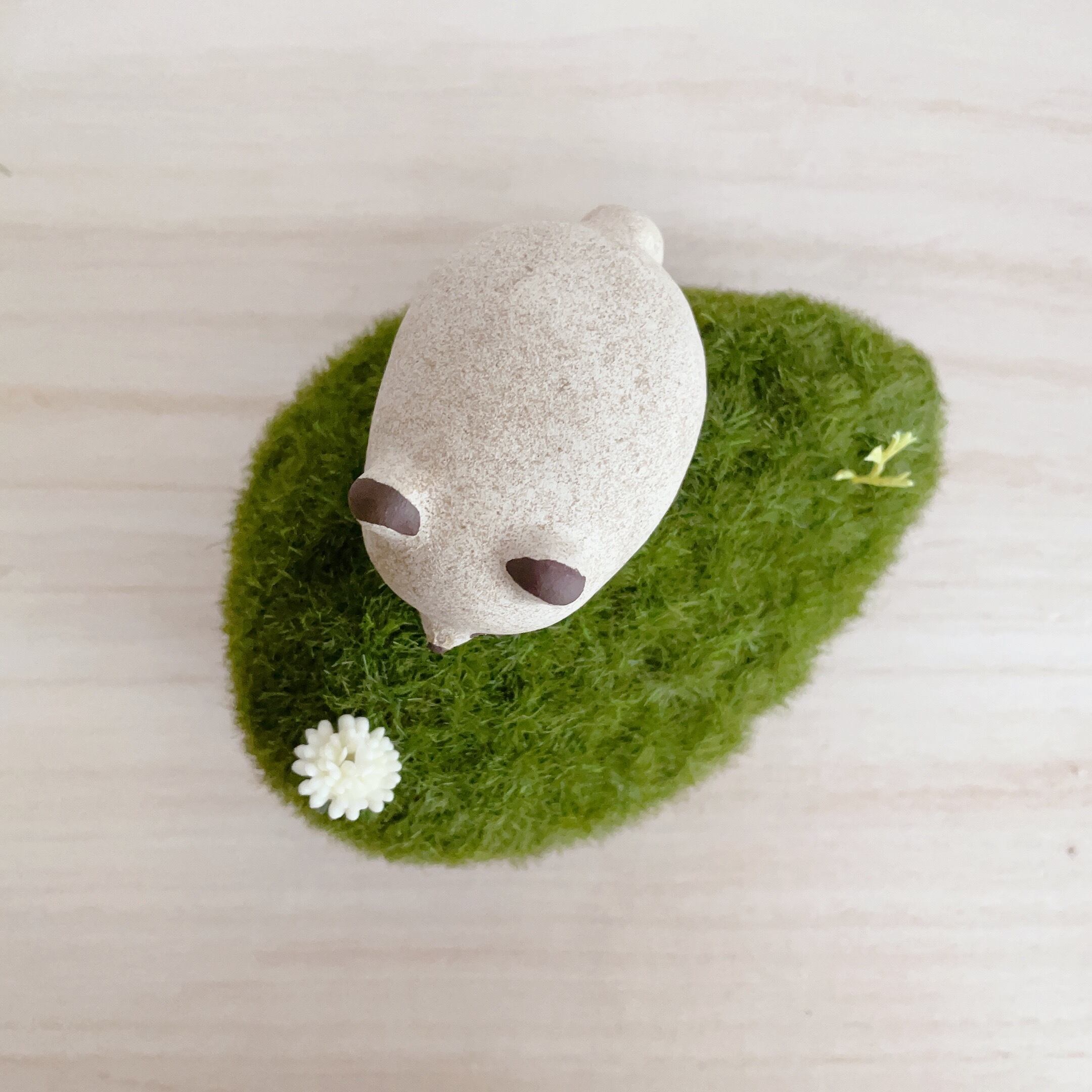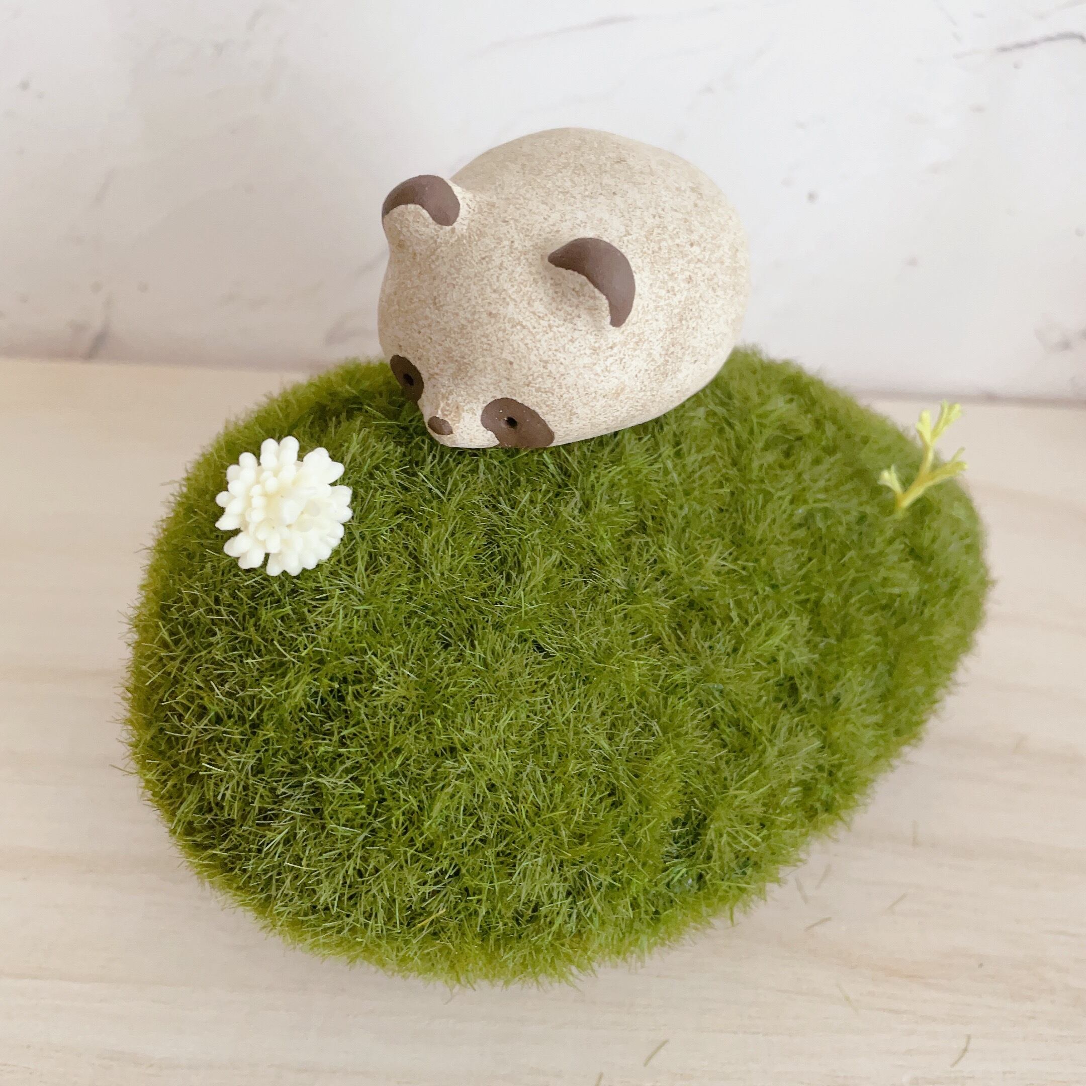 ①苔玉が安定する位置でバランスを見ながらたぬきたちを配置