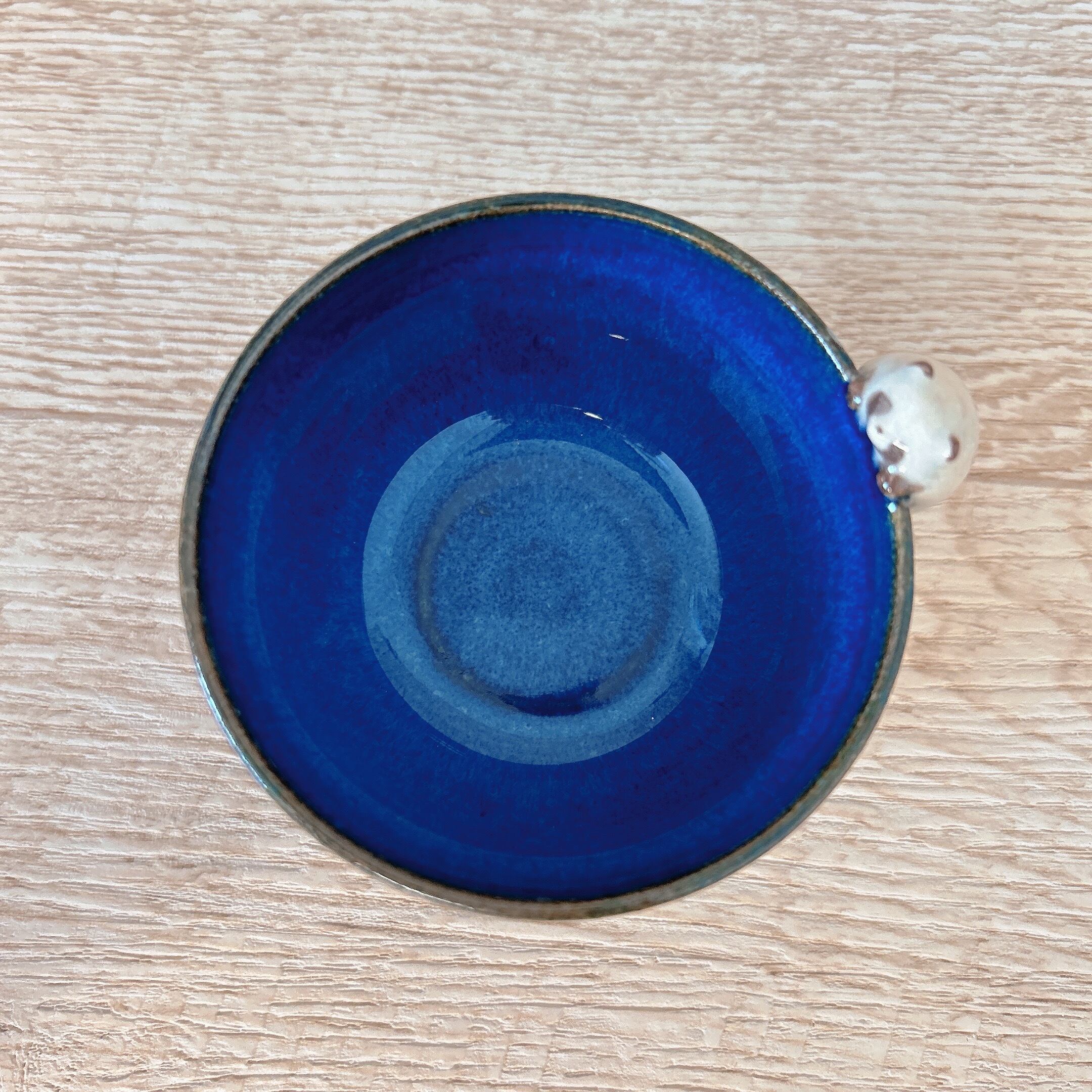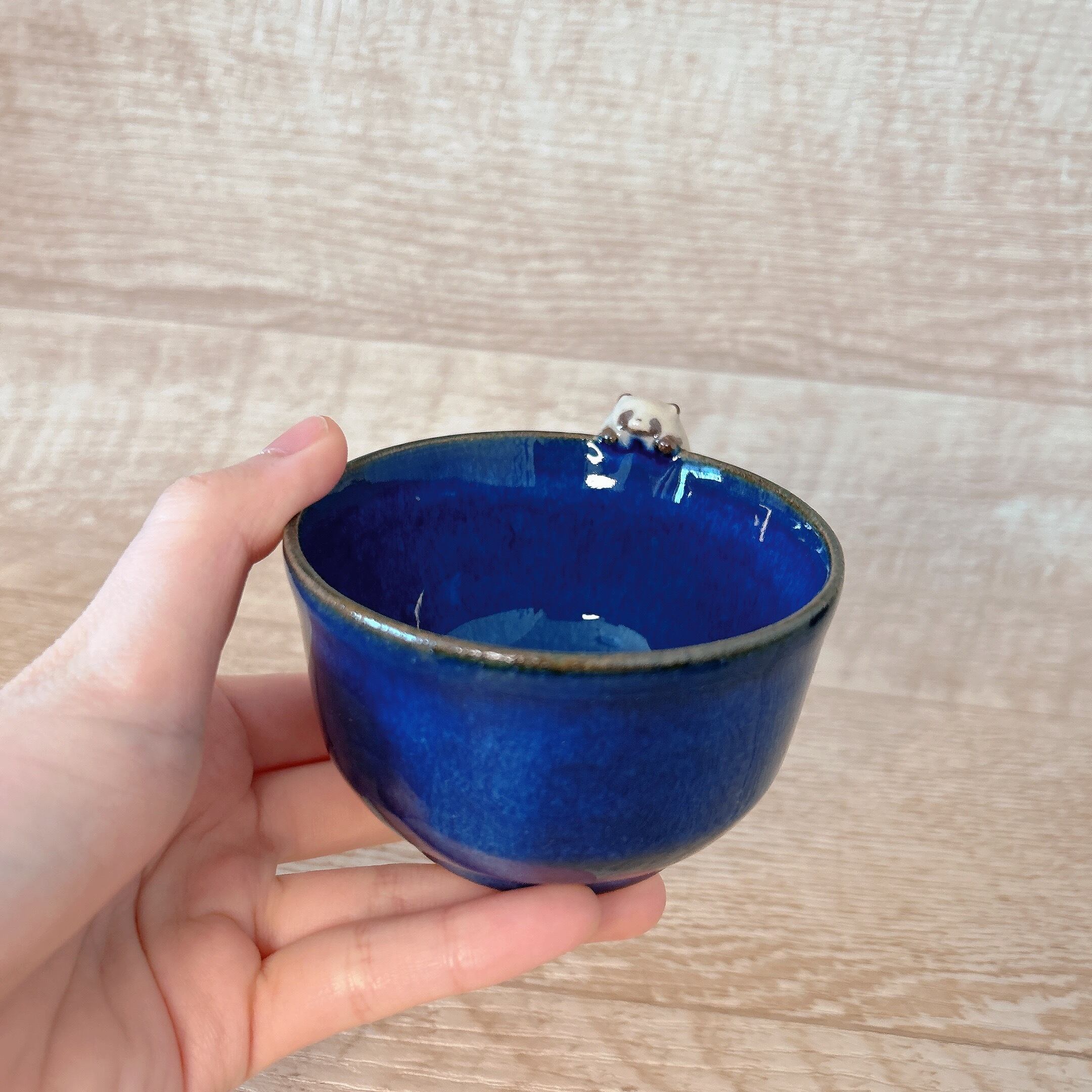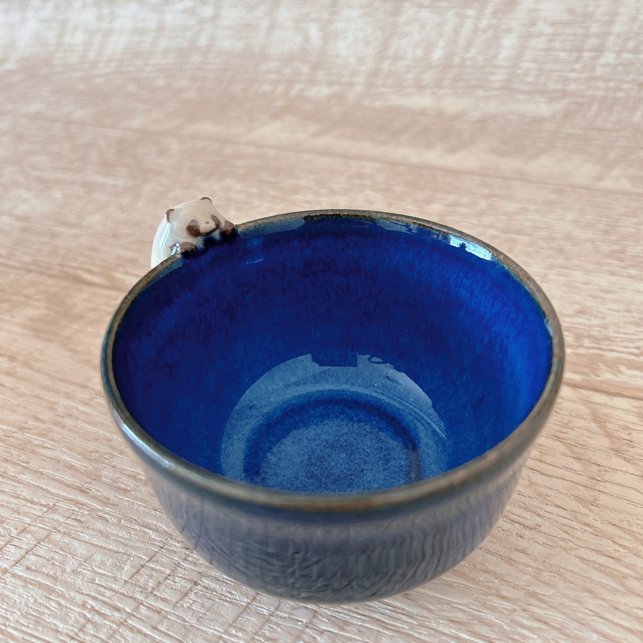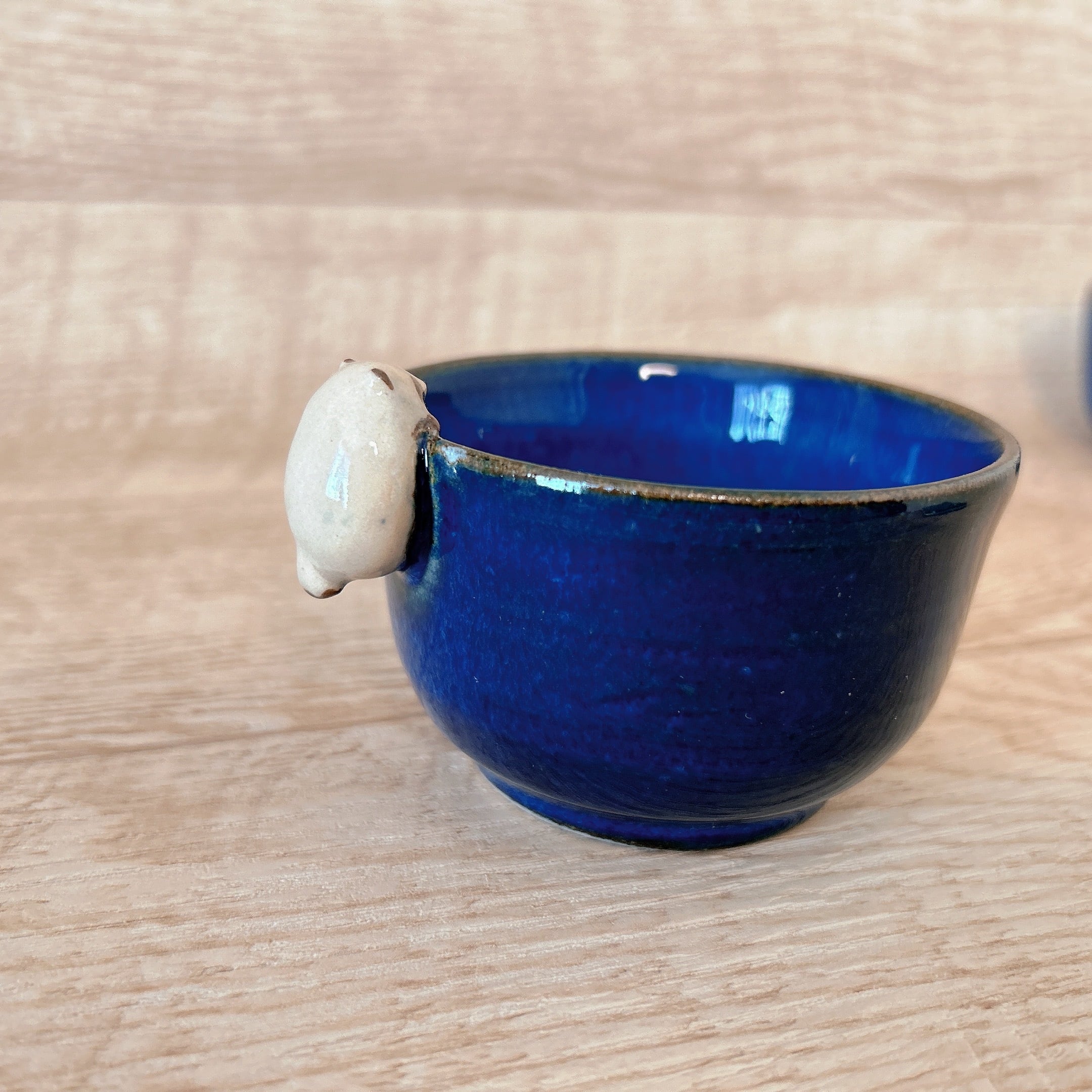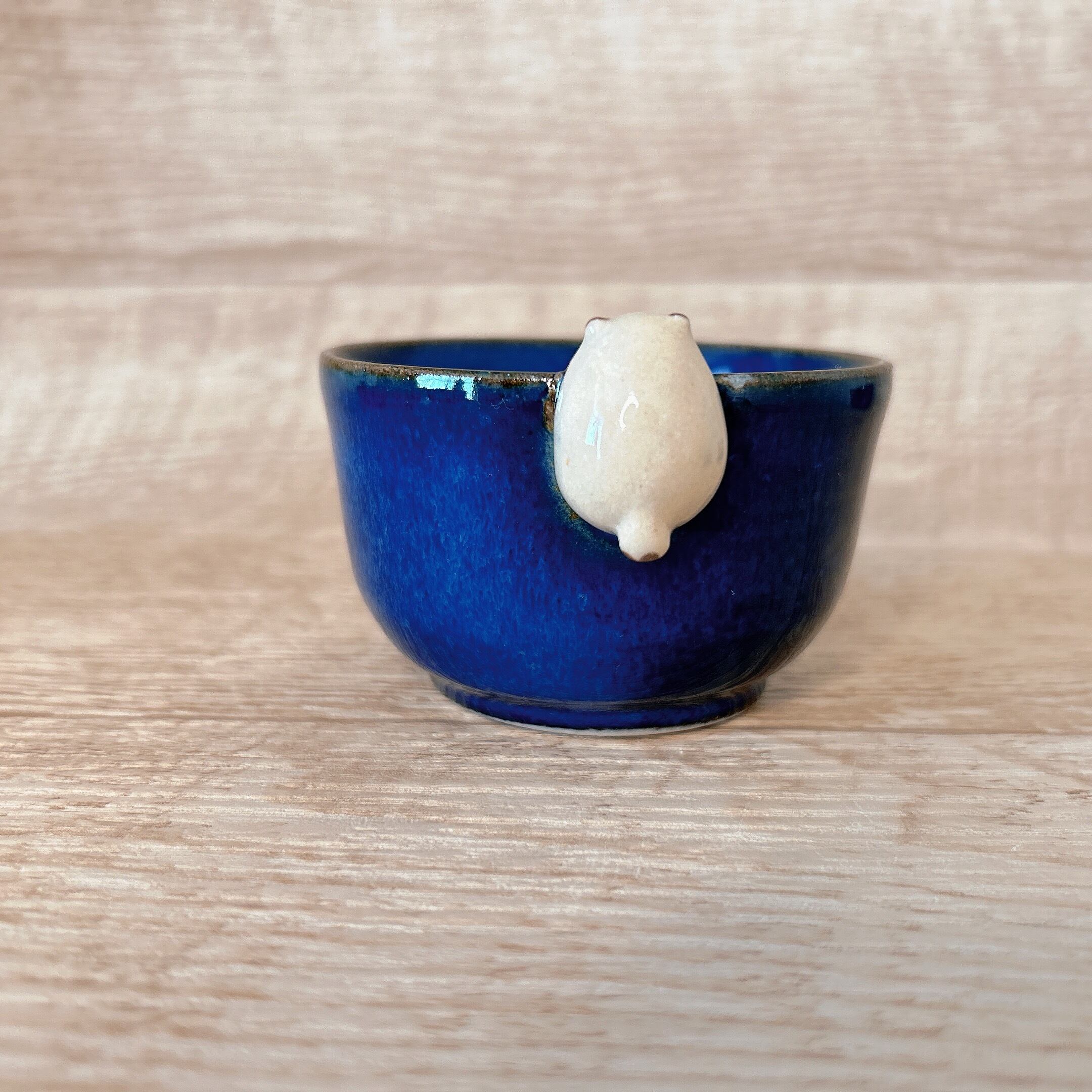 小さなたぬきがちょこんとのっている器に深い青が魅力の釉薬をかけて仕上げました。