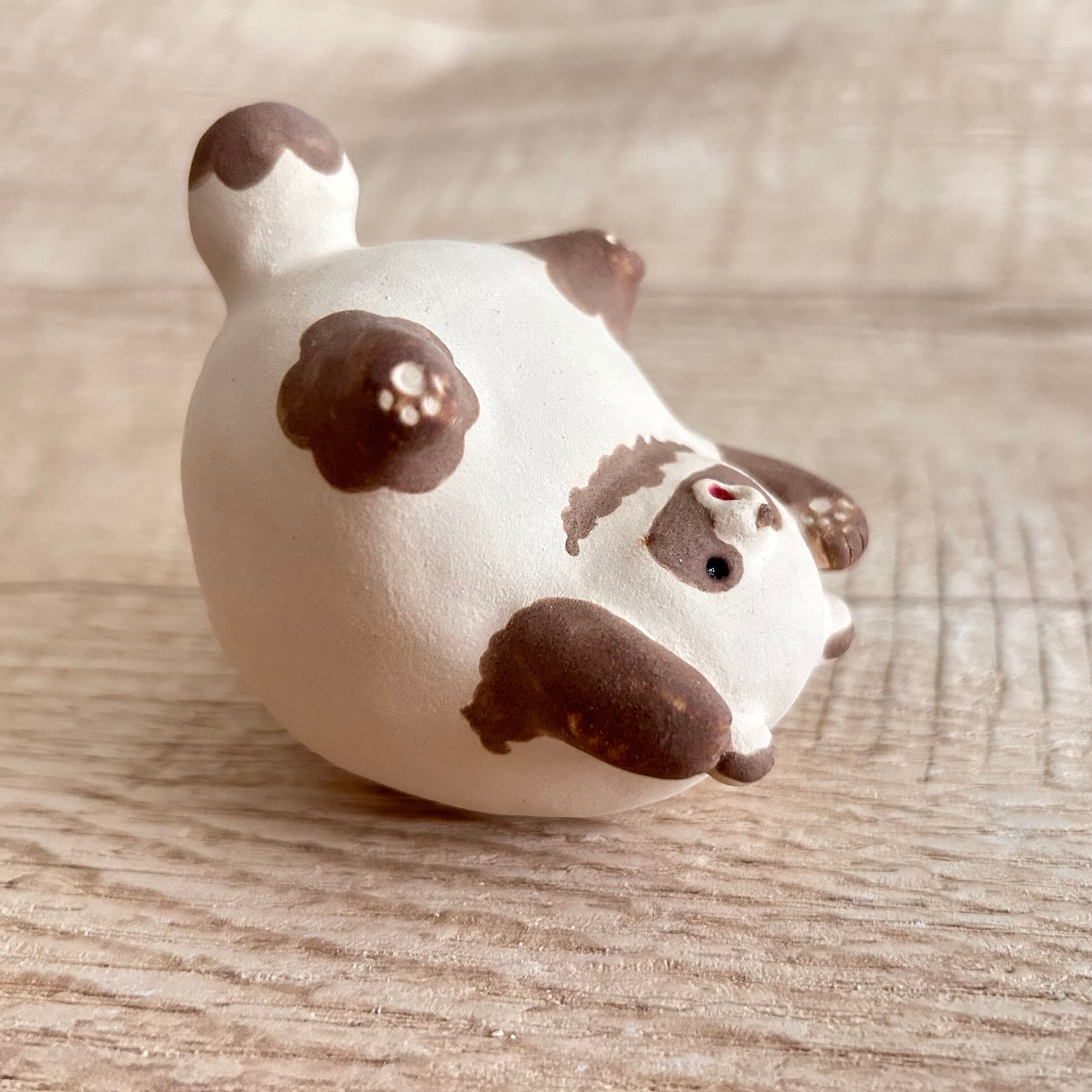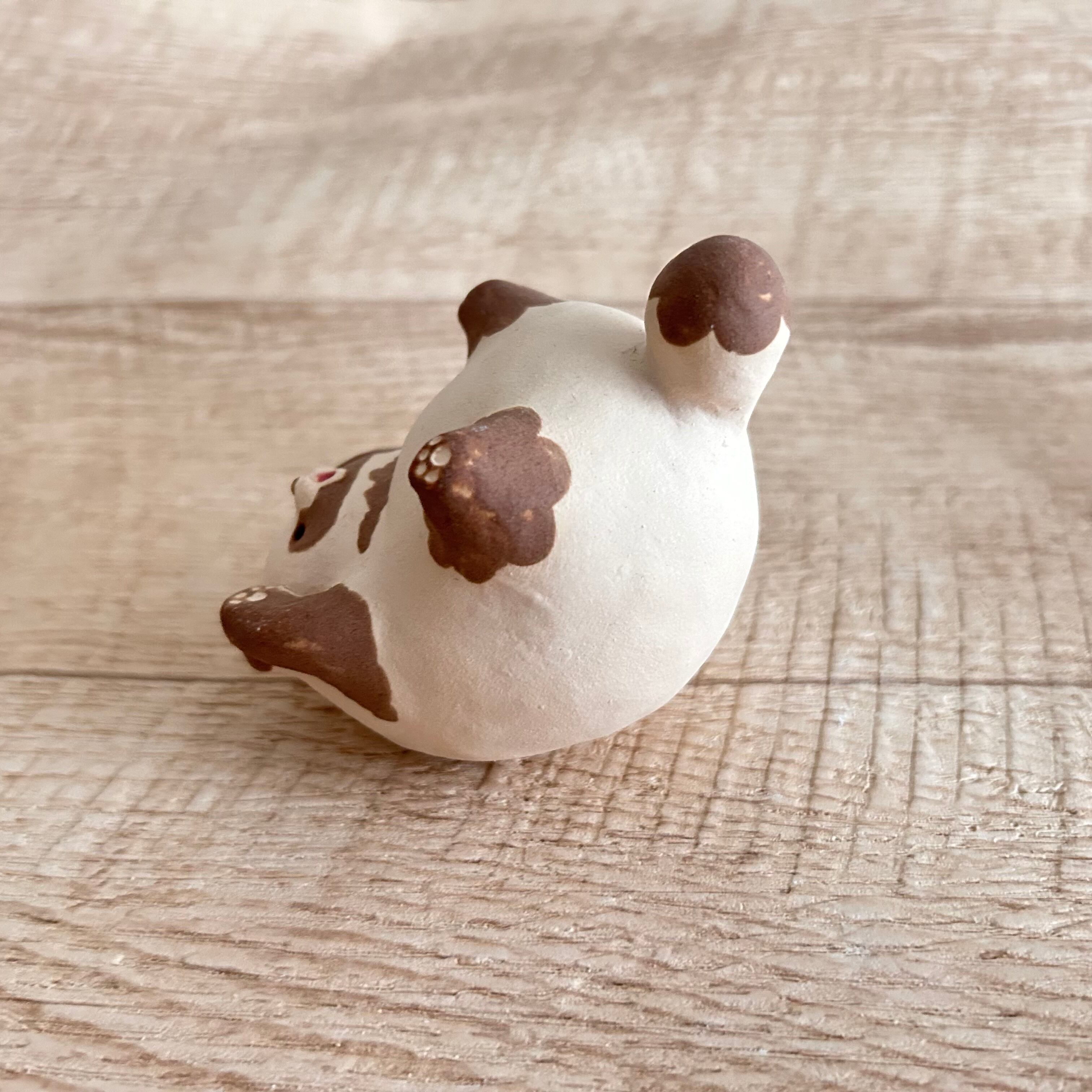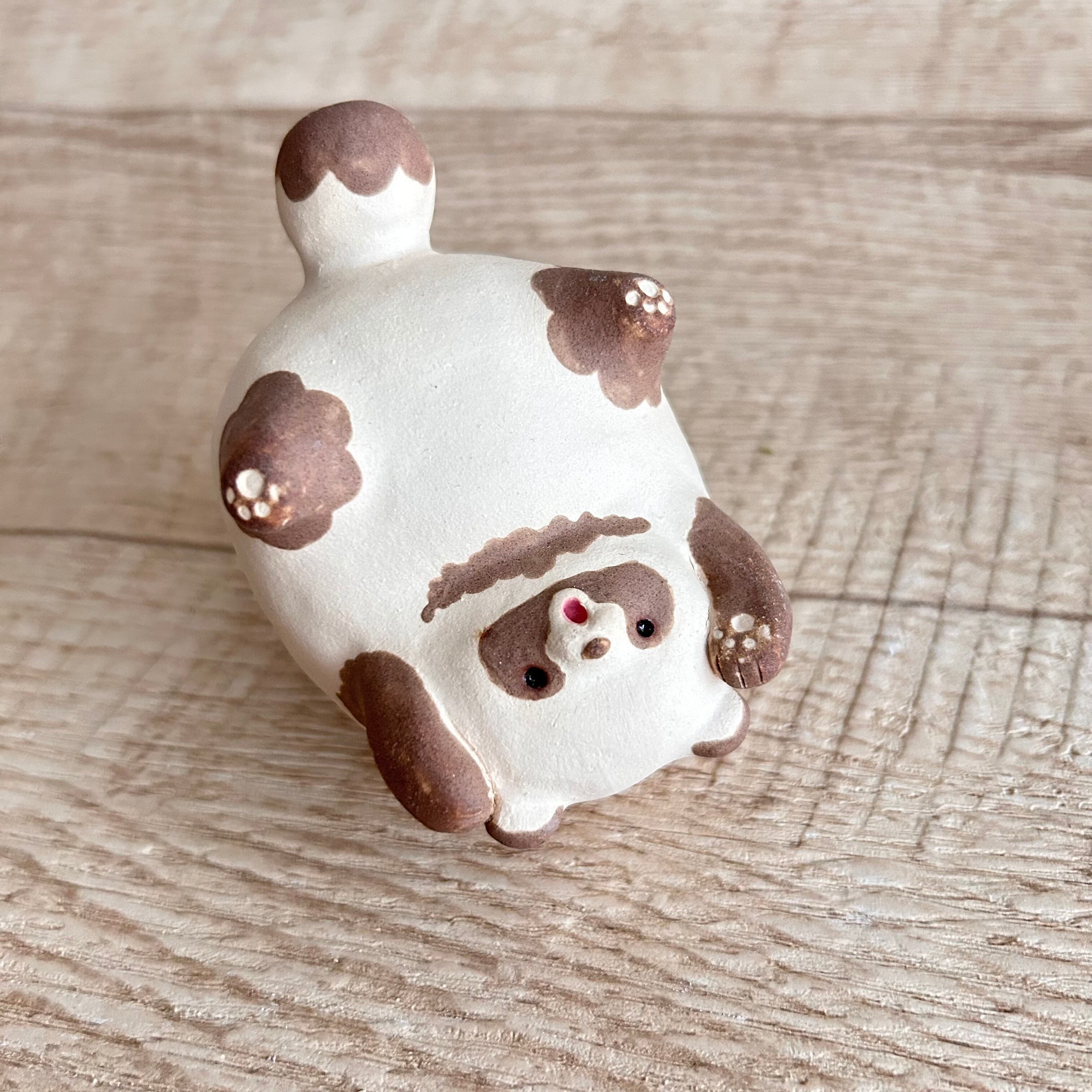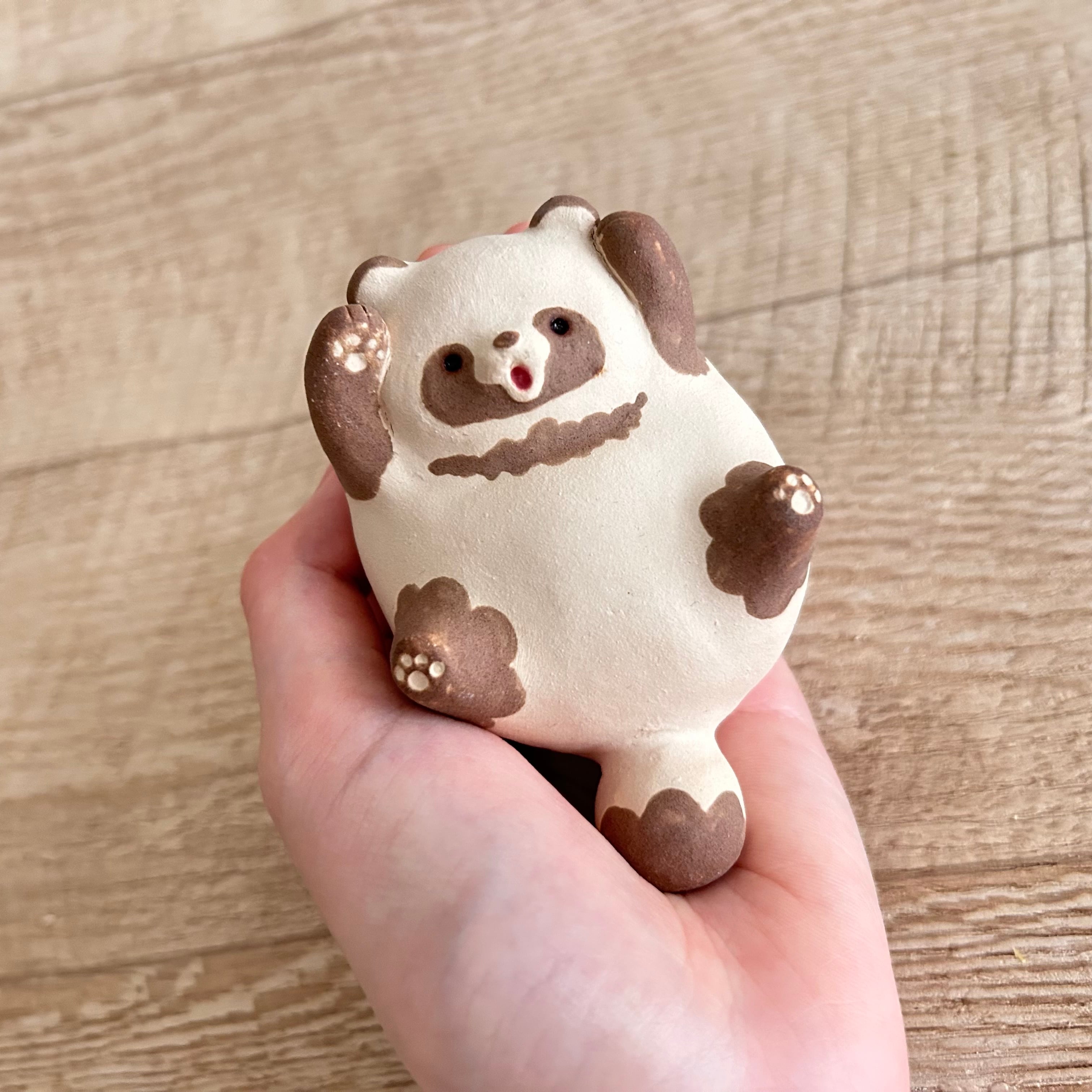 でんぐりがえしから起き上がれないむっちりたぬきの置き物です。