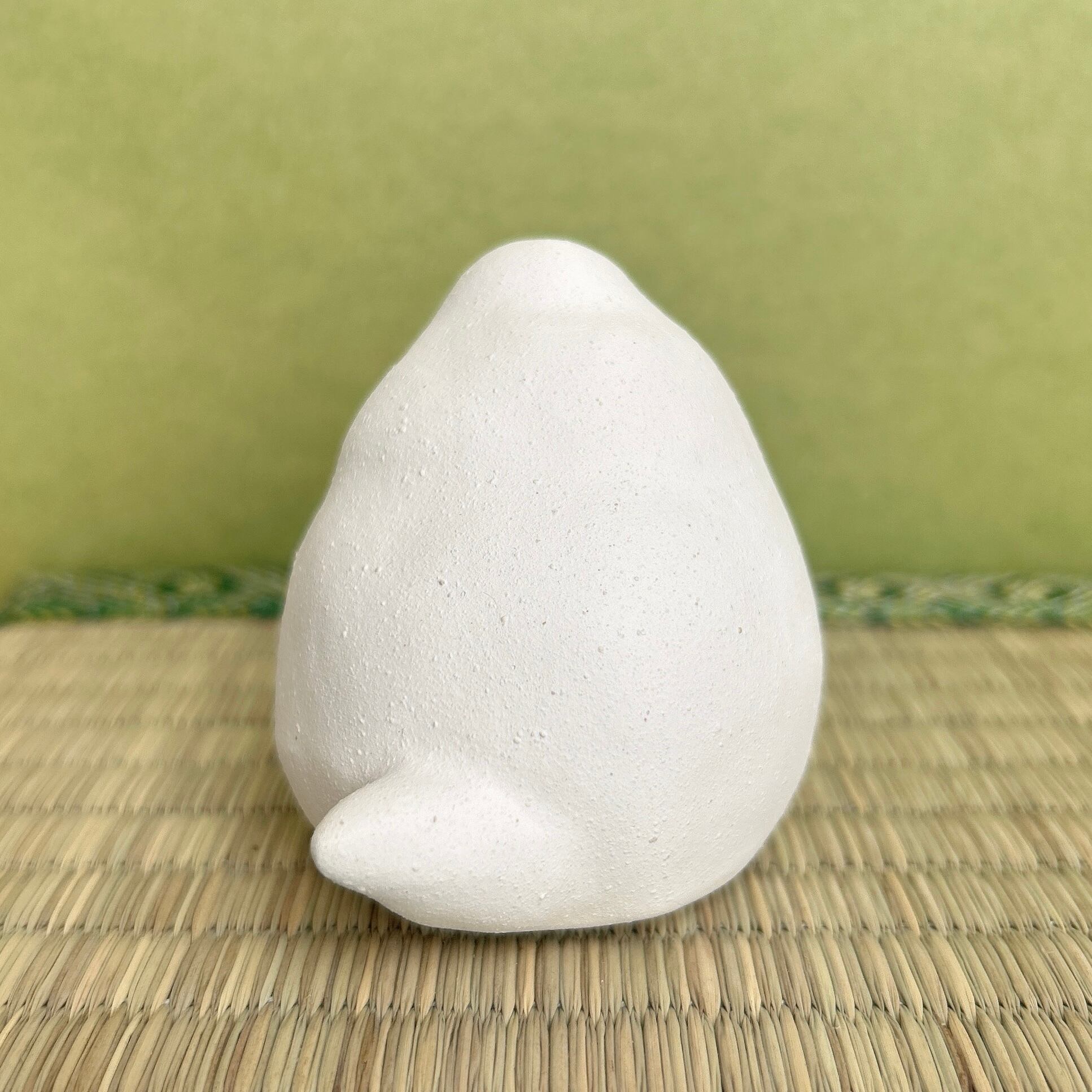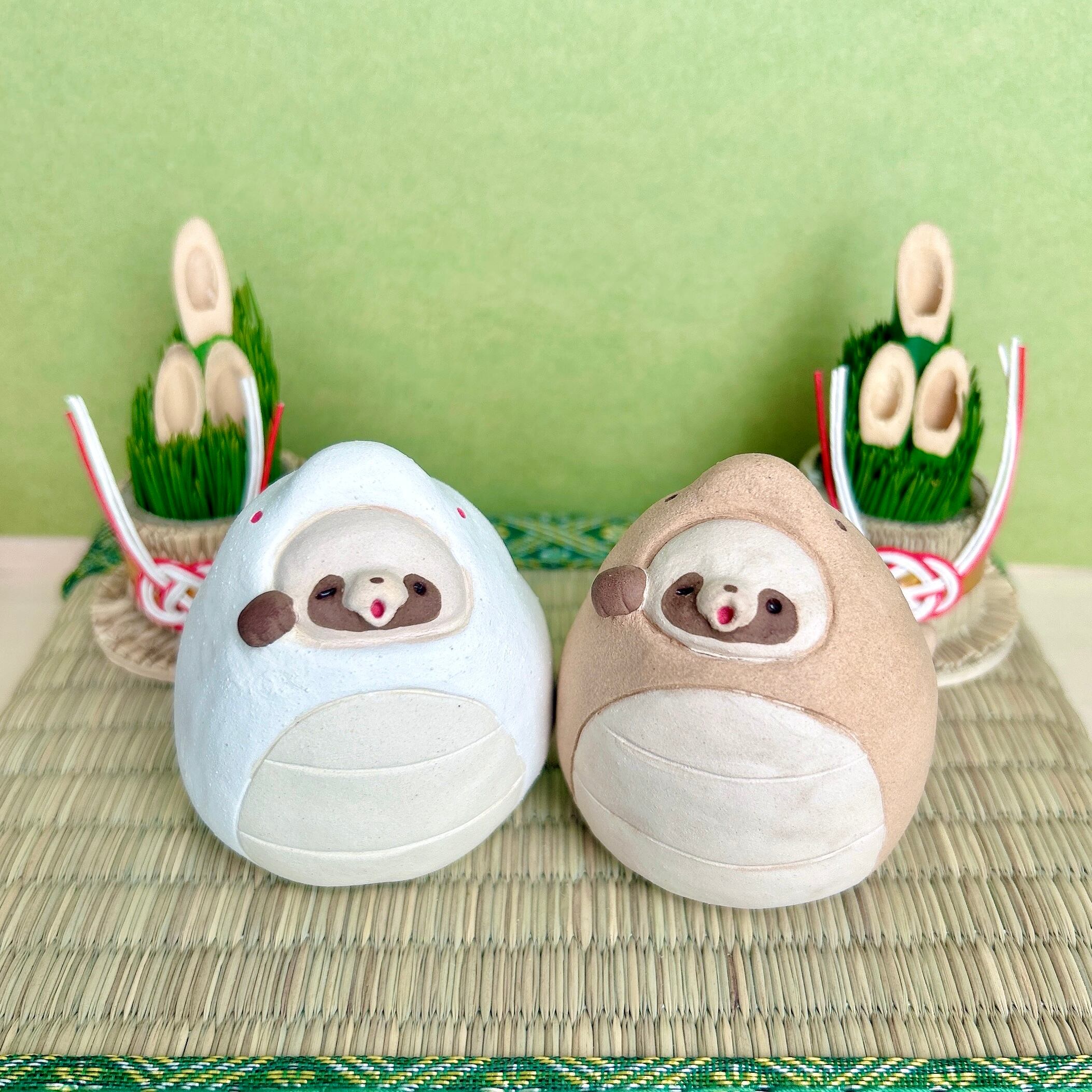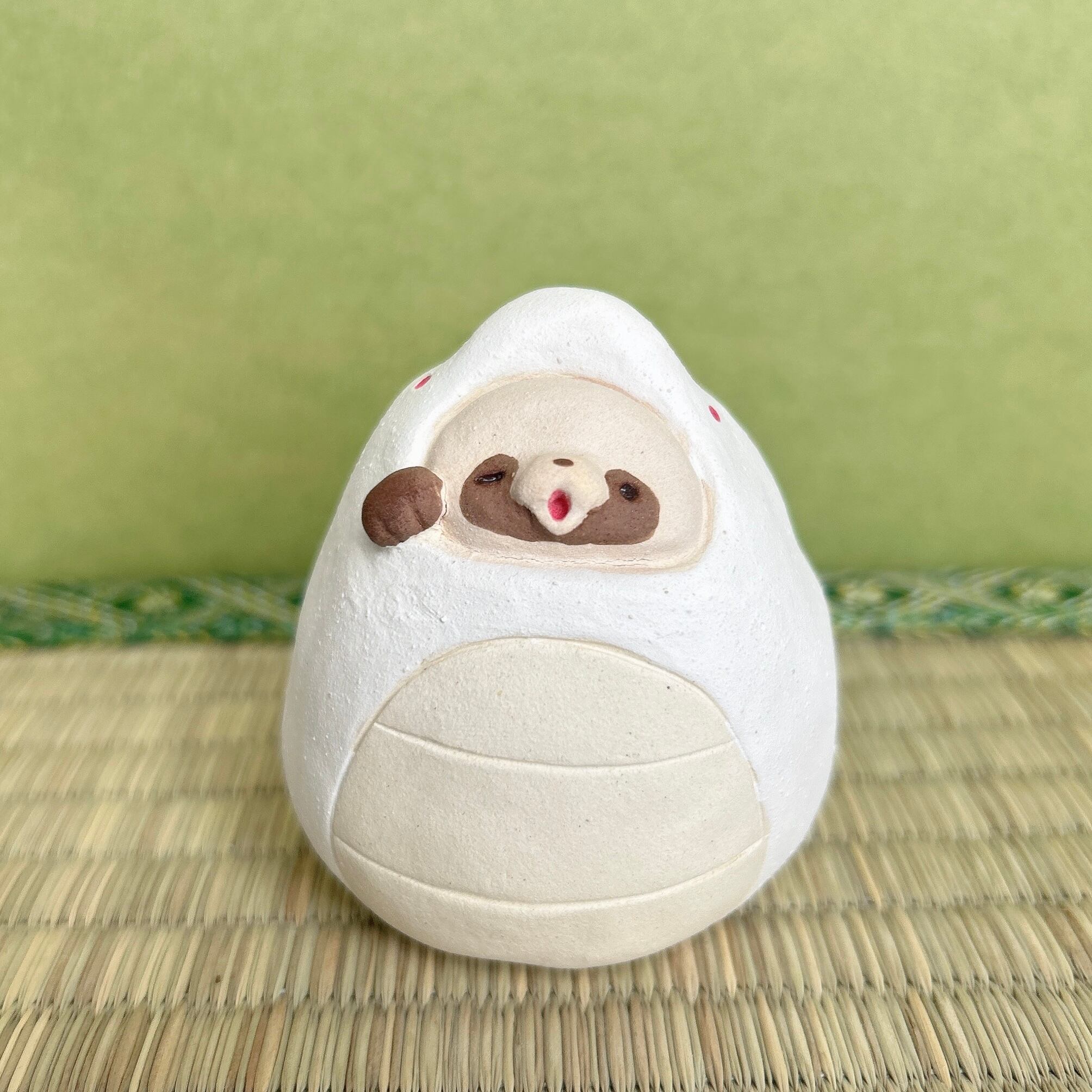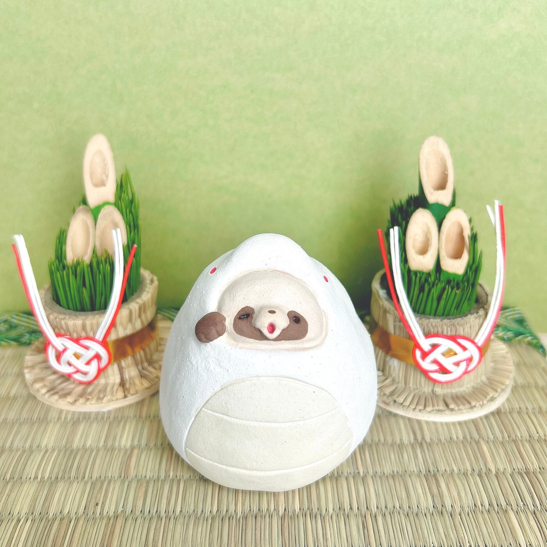 来年の干支、巳に化けようとしたたぬきの置物です。縁起が良いと言われる白蛇に扮しています。