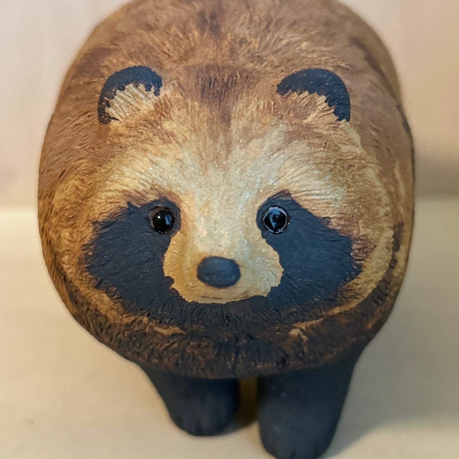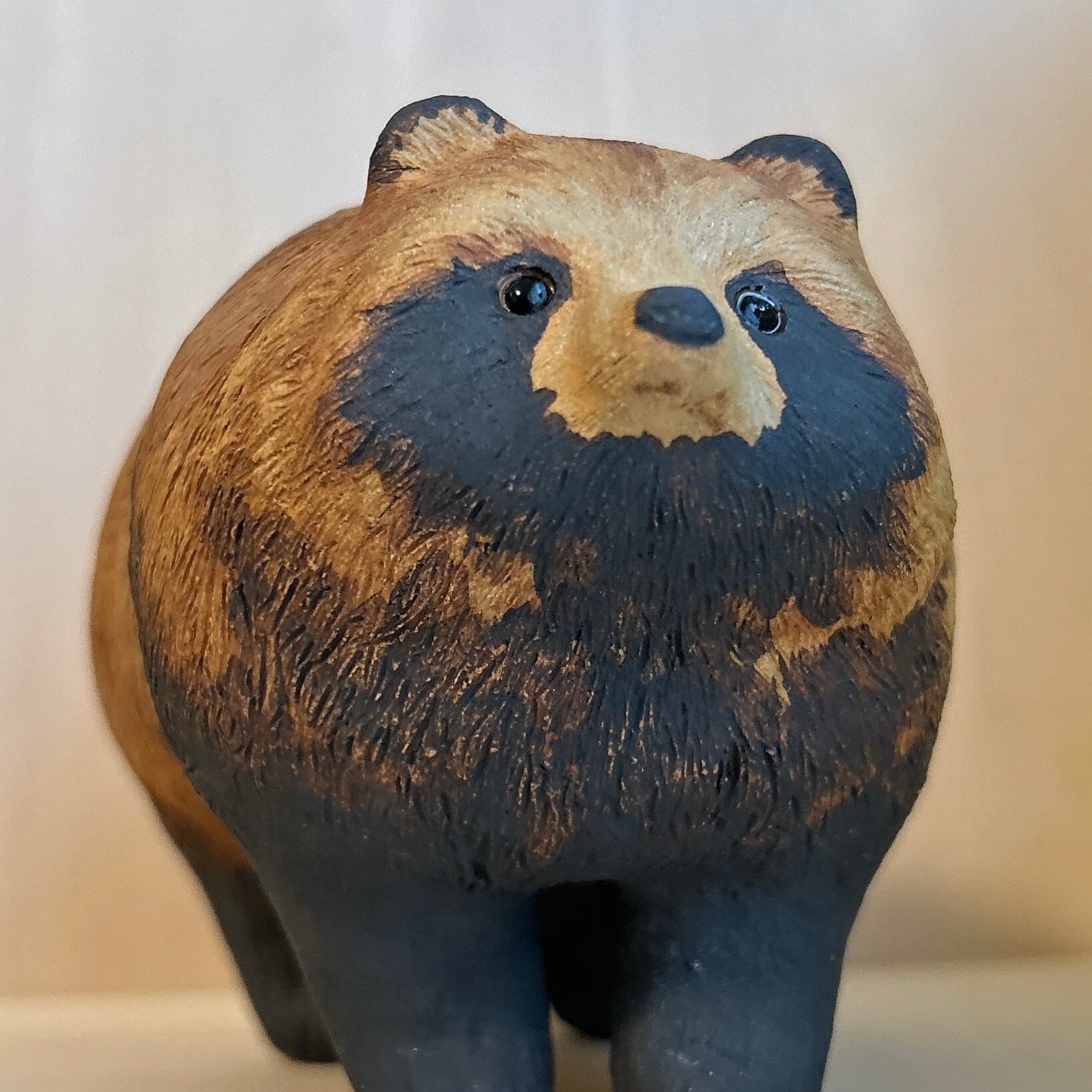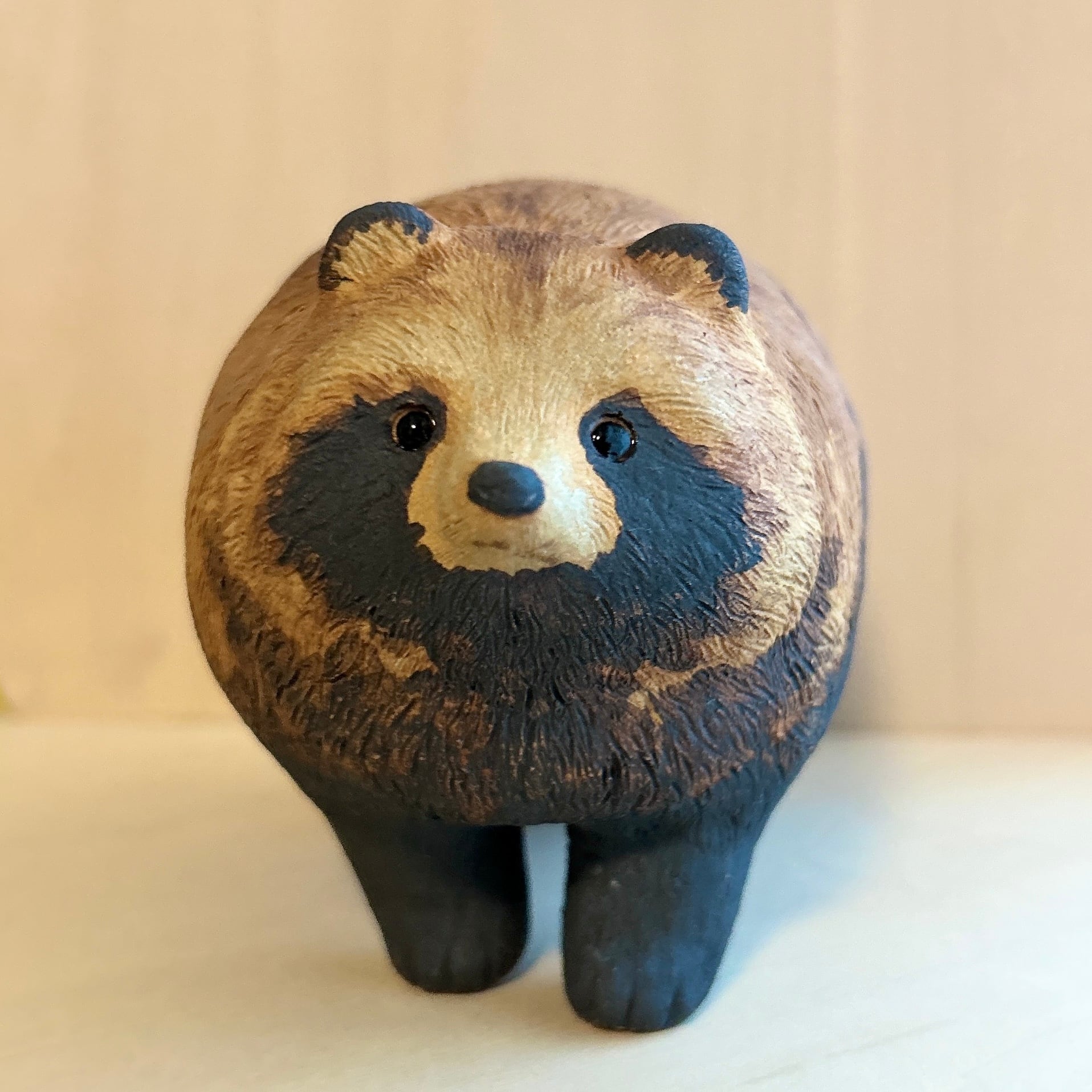 冬毛のたぬきがもすもす歩く姿の置き物です。