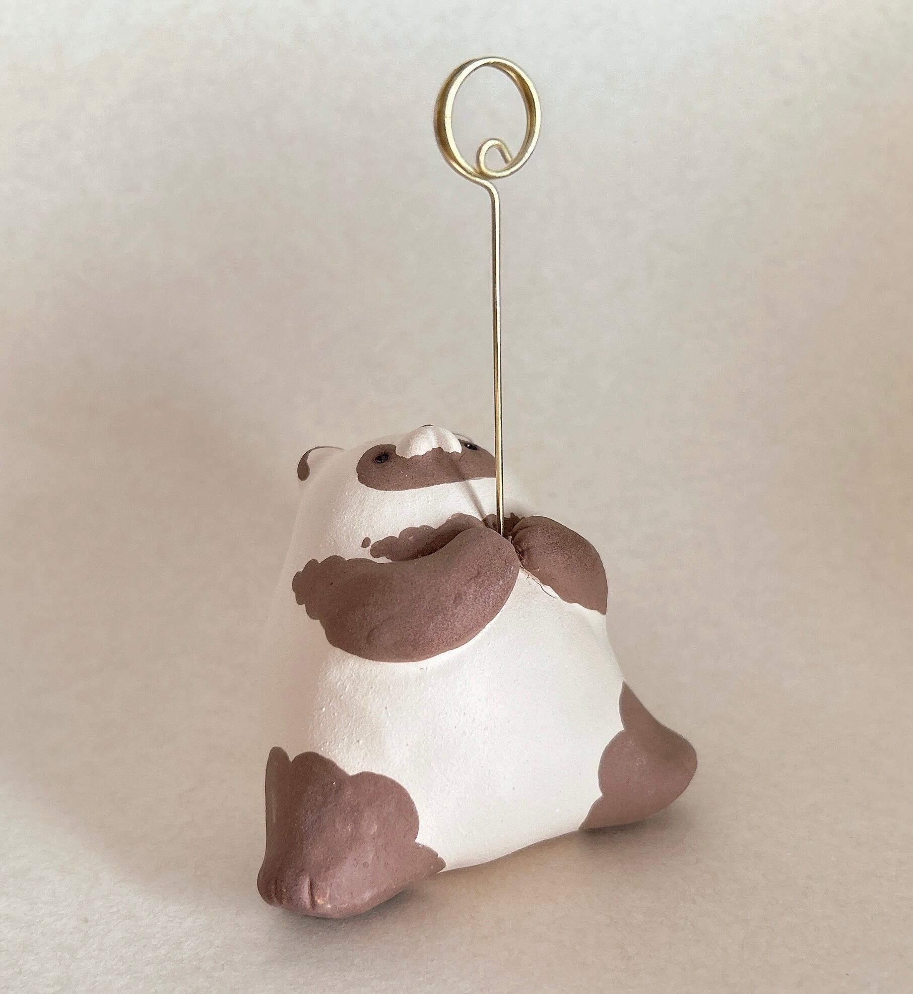 メモスタンドを掲げるようにもつたぬき